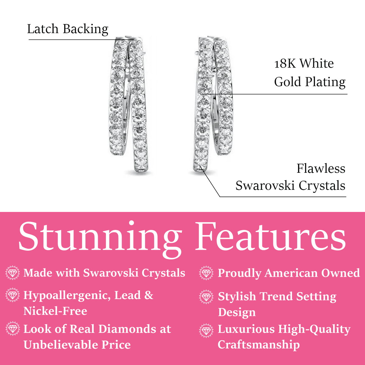 Handcrafted in 18k White Gold Plated brass. Set with 26 Swarovski accent crystals (1.5mm). Dimensions: 5mm(w) x 20mm(h) x 20mm(l). Closure: Lever Back. Hypoallergenic, lead-free, nickel-free. Includes C&C branded gift box.