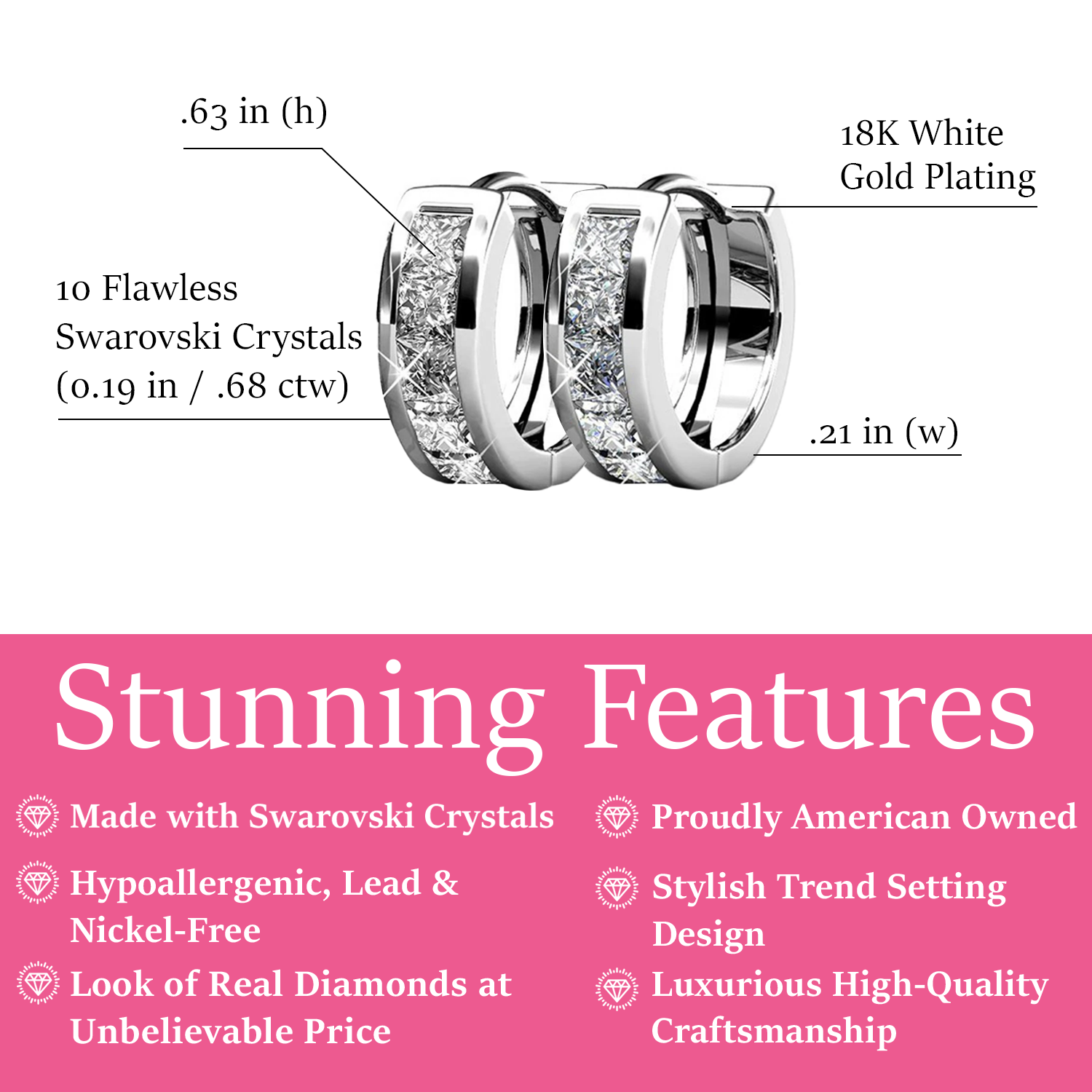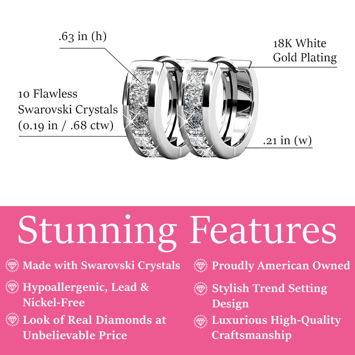 Handcrafted in 18k white gold plating over brass with 10 Swarovski® crystals (5mm each). Dimensions: 16mm x 5.5mm. Closure: Latch back. Hypoallergenic, lead & nickel free.