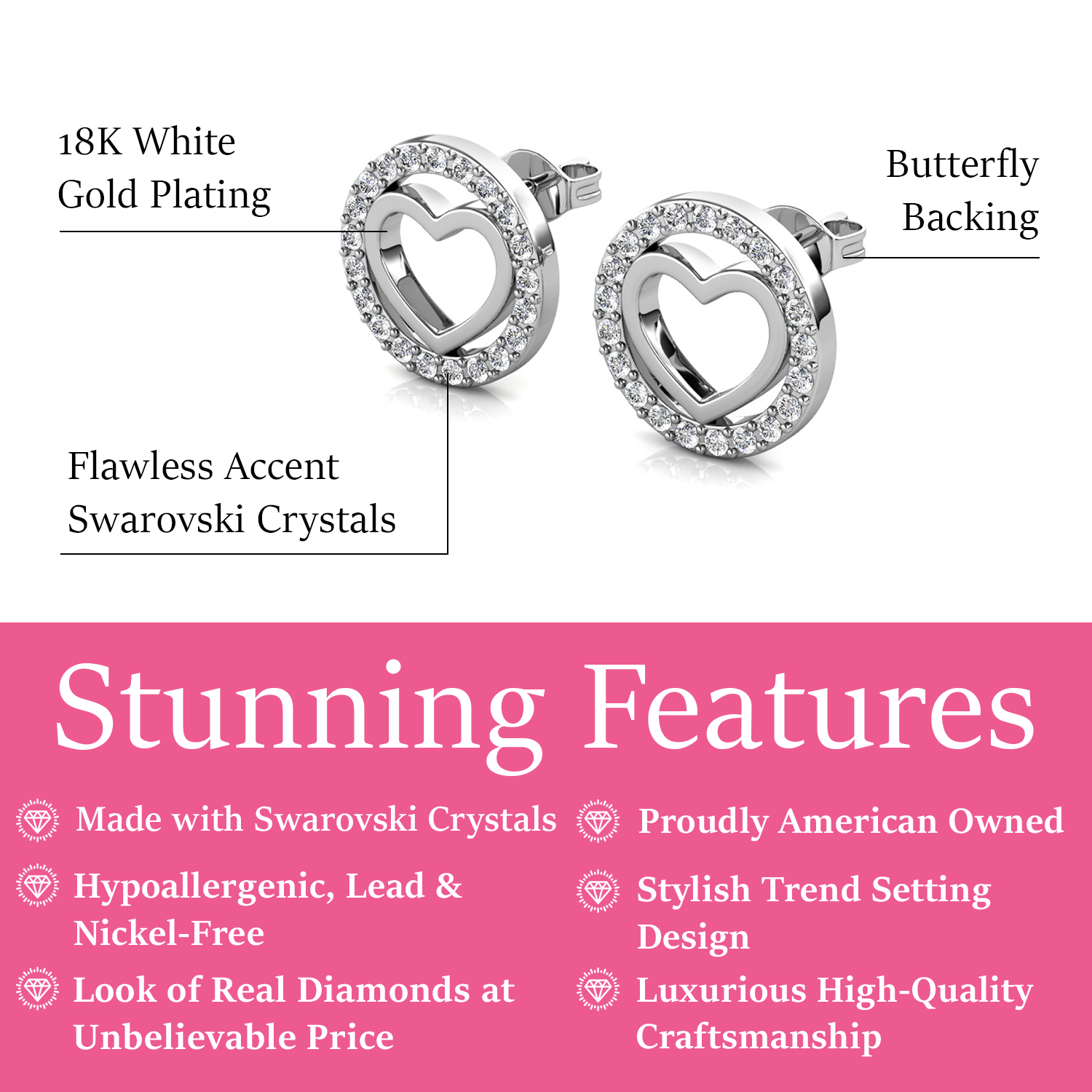Designed in 18k white gold plated hypoallergenic brass. Includes 21 Swarovski accent crystals. Earring dimensions: 10mm (w) × 10mm (h) × 1.7mm (l). Butterfly back closure. Lead- and nickel-free.