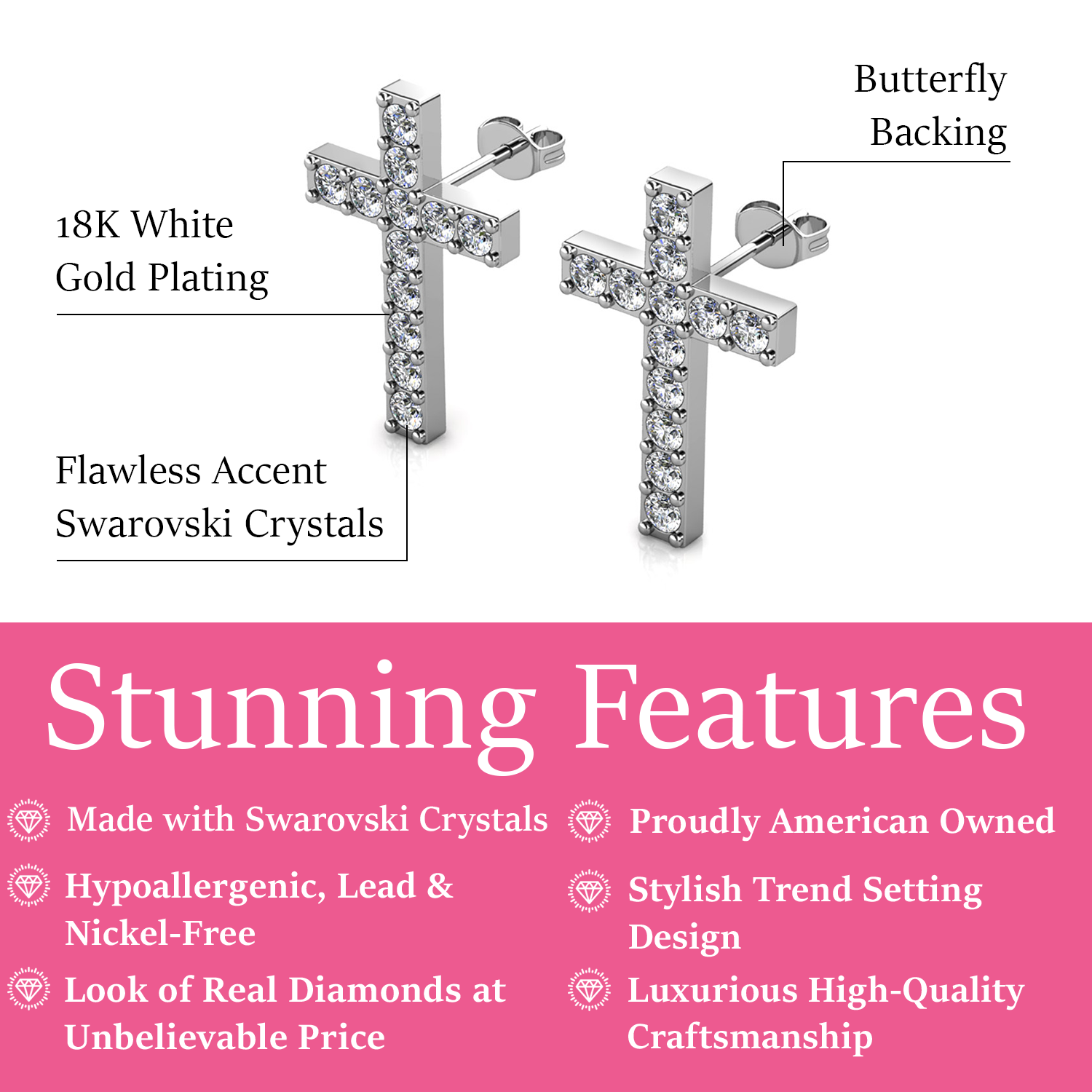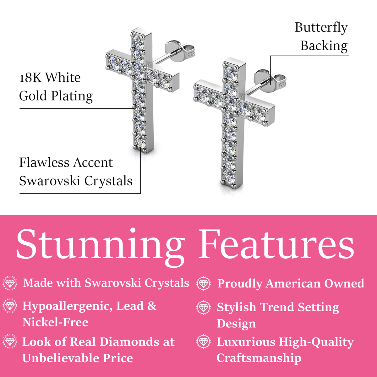 Made of 18k white gold plated hypoallergenic brass with 1 featured Swarovski crystal and 6 accent stones. Dimensions: 14mm (w) × 12mm (h) × 2.8mm (l). Butterfly back closure. Lead- and nickel-free.