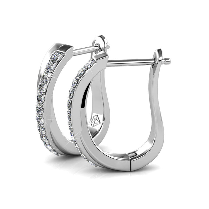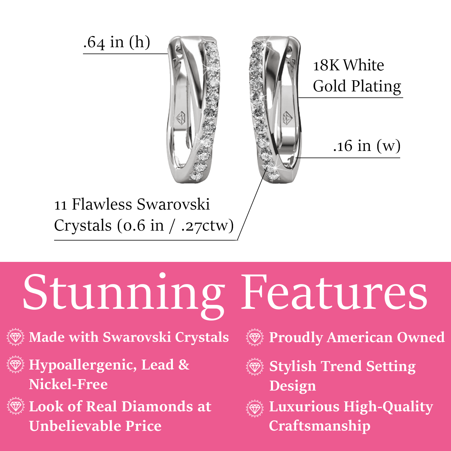 Handcrafted in 18k white gold plated brass, set with 22 Swarovski® crystals (1.3mm each). Earring dimensions: 4.2mm (w) x 16.4mm (h) x 14mm (l). Latch back closure. Hypoallergenic, lead-free and nickel-free. Includes C&C branded gift box.