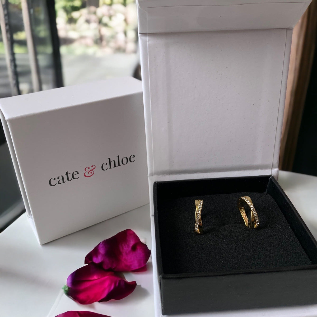These Amaya Twisted Hoop Earrings by Cate & Chloe bring a modern twist to classic glamour. Featuring a sleek, sculptural hoop design adorned with 22 dazzling Swarovski crystals, they strike the perfect balance between bold sparkle and refined elegance. Ideal for everyday sophistication or dressed-up statements.