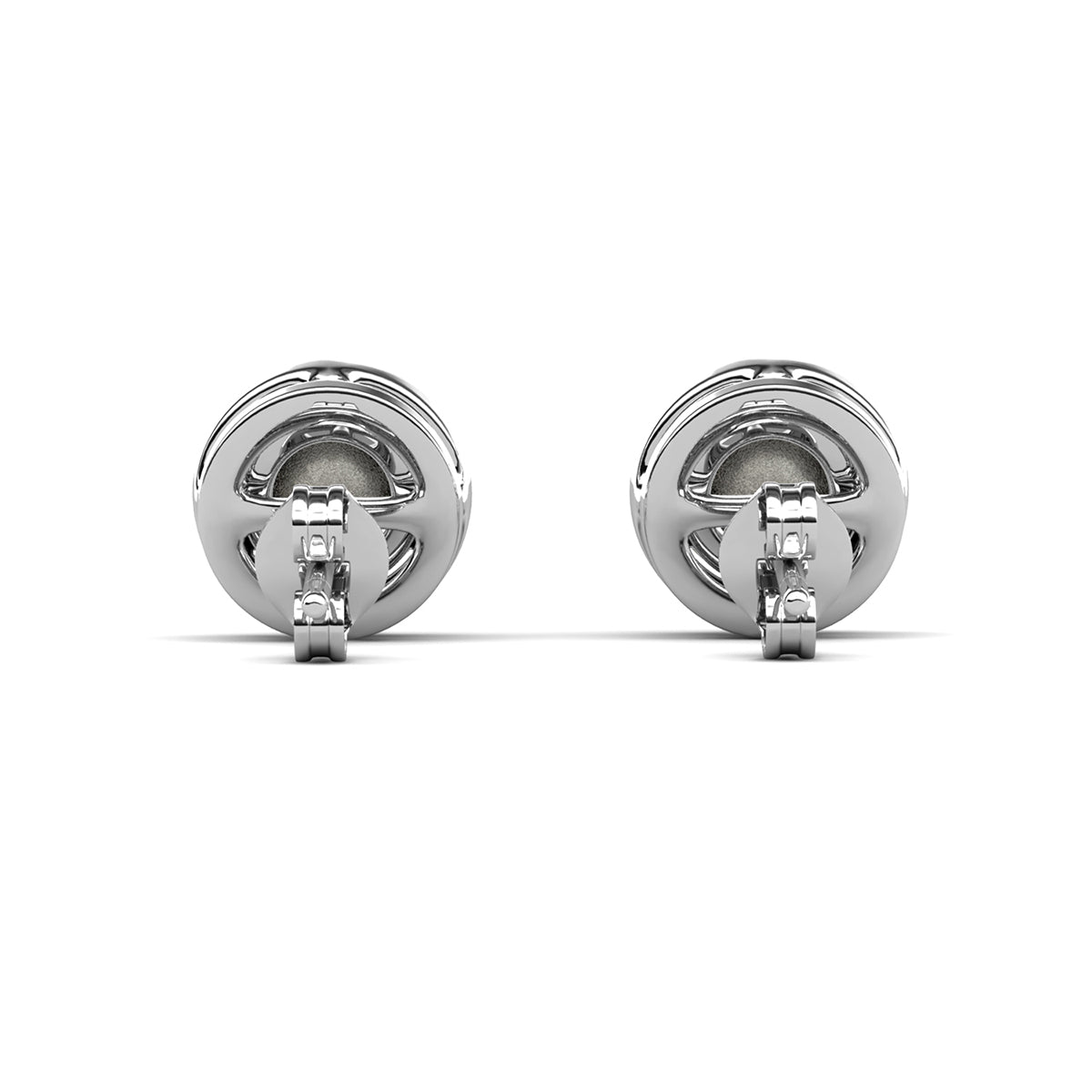 Crafted in 18k white gold plated brass with 2 5.27mm round-cut Swarovski crystals and 36 0.9mm accent stones. Dimensions: 7.8mm x 7.8mm x 5.3mm. Push back closure. Hypoallergenic, lead and nickel free. Includes C&C branded gift box.