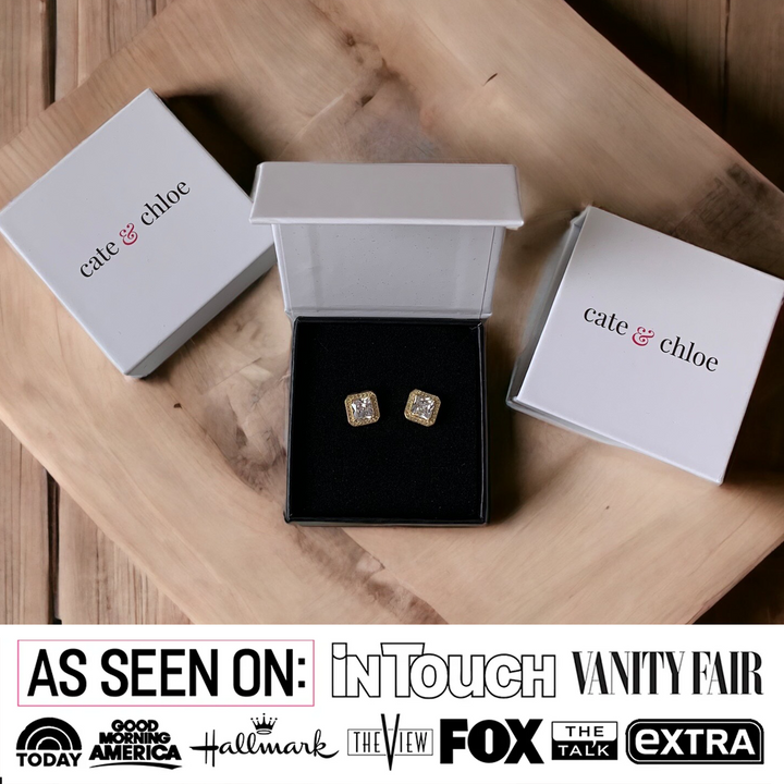 These Norah Halo Stud Earrings by Cate & Chloe blend bold sparkle with modern poise. Featuring a stunning 7mm princess-cut simulated diamond crystal surrounded by 28 accent stones, they offer maximum brilliance in a clean silhouette. Perfect for dressing up or refining your everyday style.