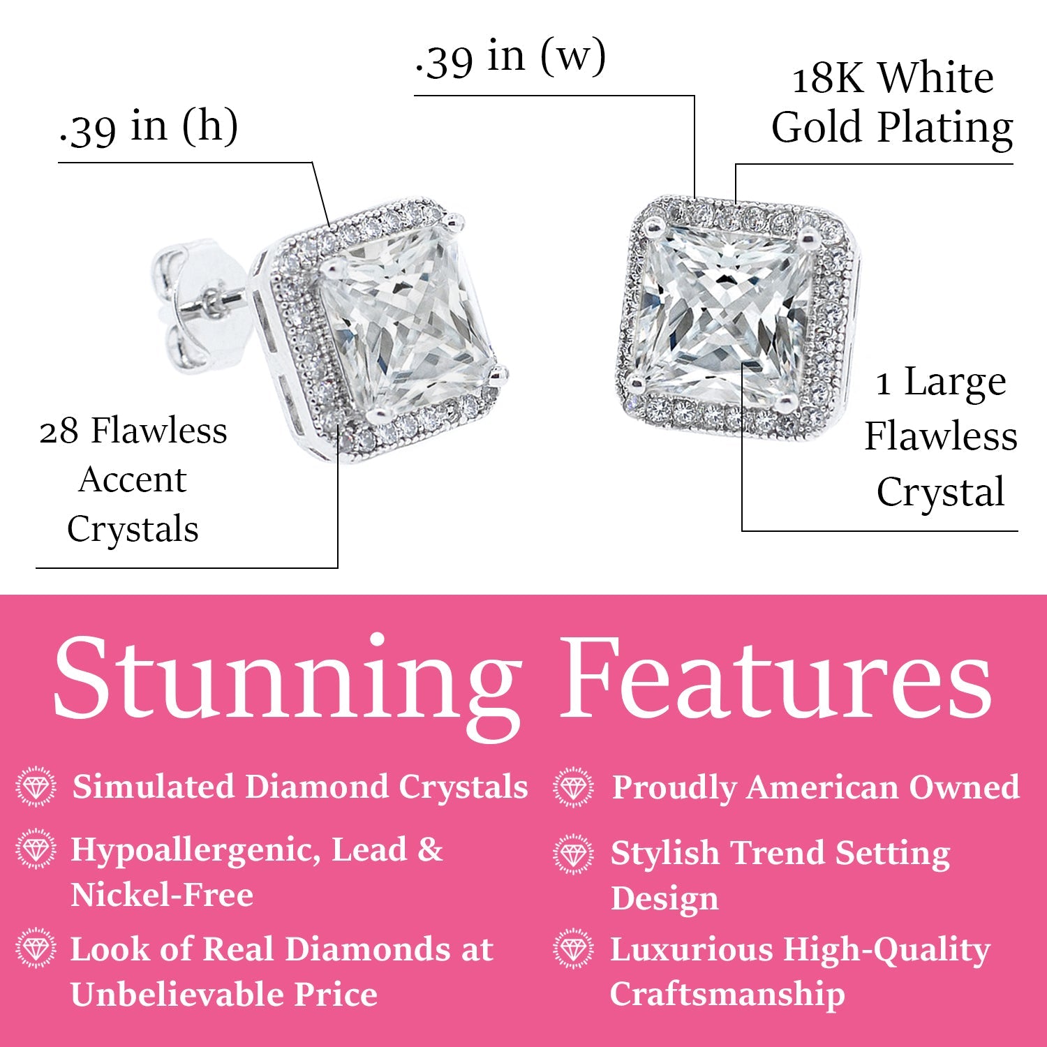 18k white gold plated brass with 1 7mm princess-cut simulated diamond crystal and 28 accent stones. Dimensions: 10mm x 10mm. Push-back closure. Hypoallergenic, lead and nickel free. Includes C&C branded gift box.