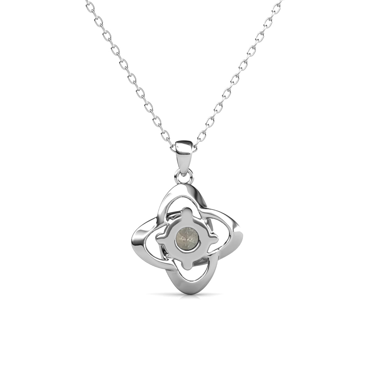 Handcrafted in 18k white gold plating over brass with 1 featured Swarovski® crystal (6.14mm round cut). Dimensions: 15.52mm x 22.79mm x 4.63mm. Chain: 16' cable chain, extendable to 18'. Closure: Lobster clasp. Hypoallergenic, lead & nickel free.