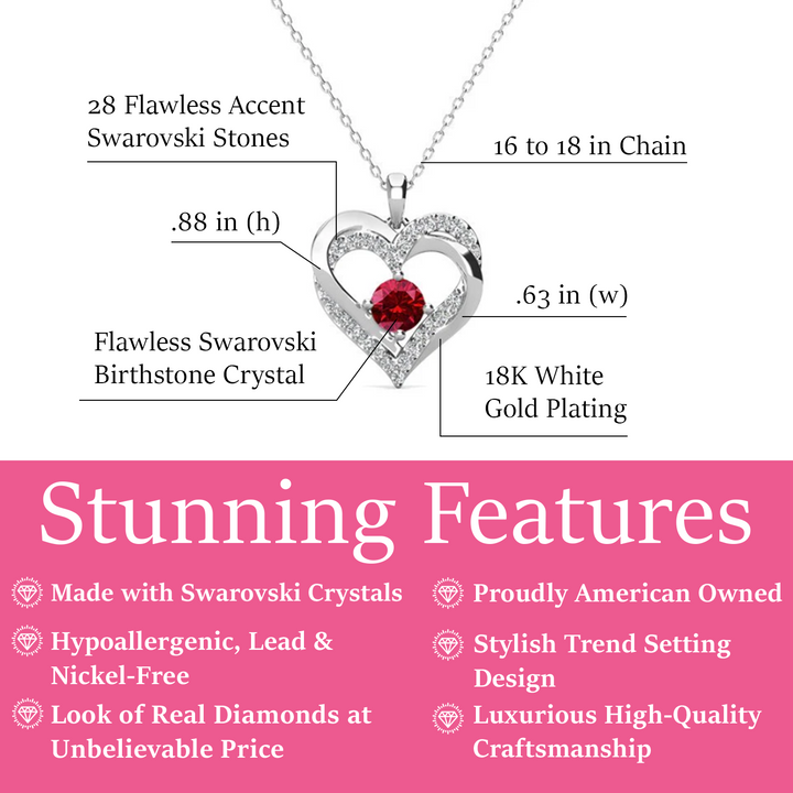 This Forever January Birthstone Double Heart Necklace by Cate & Chloe channels warmth and strength through its brilliant garnet-colored Swarovski® crystal centerpiece. Two hearts intertwined represent enduring love and loyalty, while 28 sparkling accents add radiant dimension. An ideal expression of passion and personal elegance.