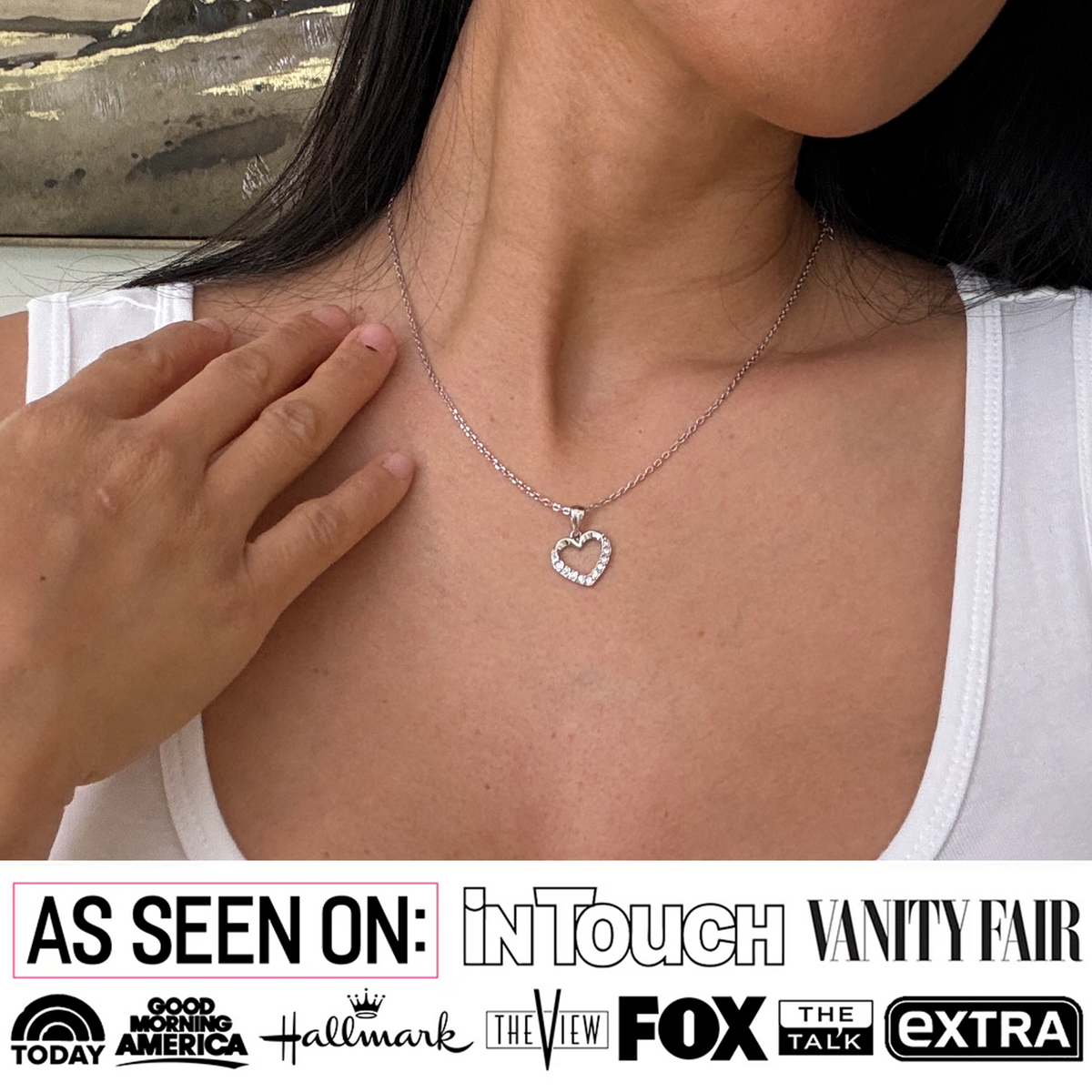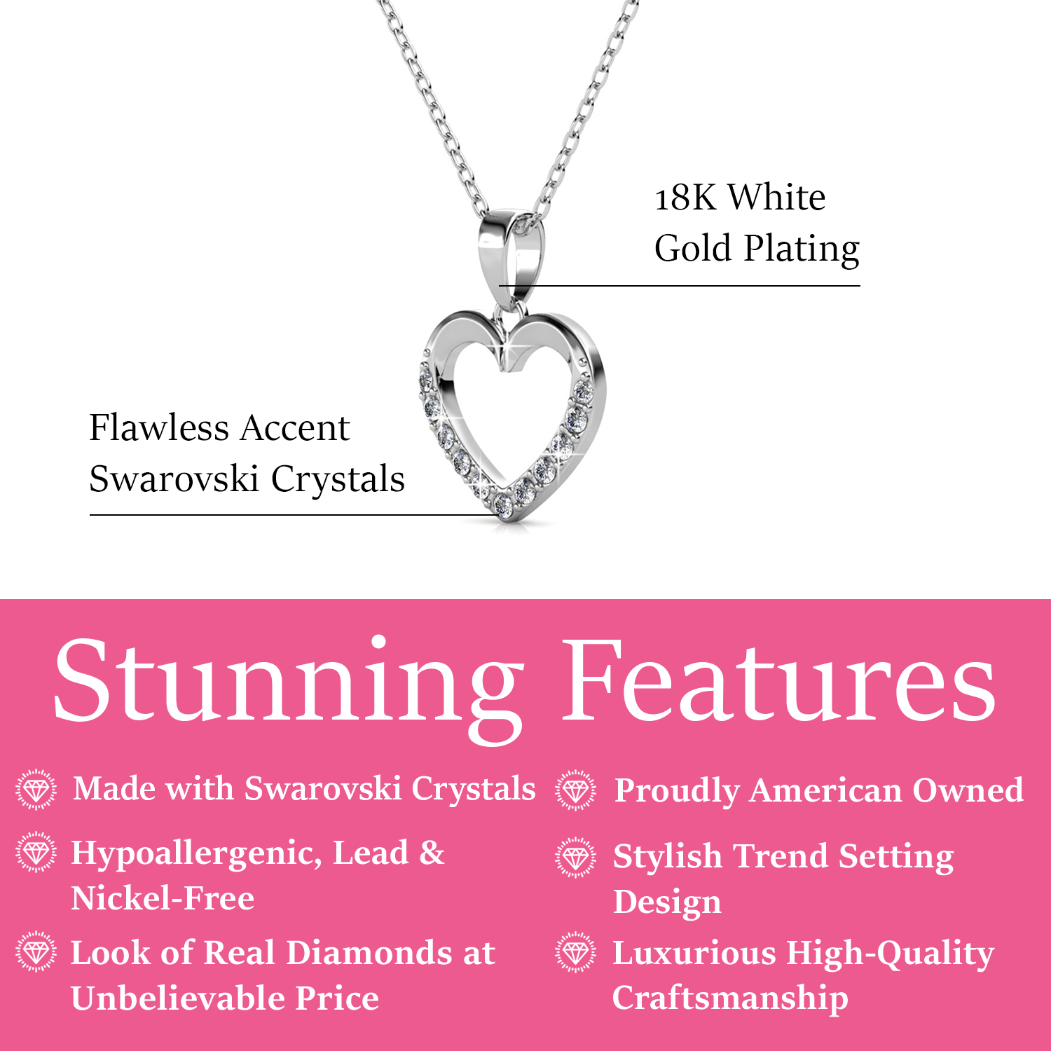 Handcrafted in 18k white gold plated brass with 11 Swarovski accent stones (1.5mm). Pendant measures 14.2mm x 12.6mm x 2mm. 17.5' cable chain with lobster clasp. Hypoallergenic, lead and nickel free.