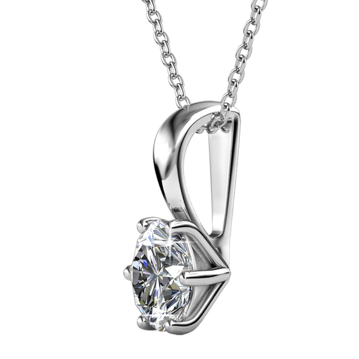 Handcrafted in 18k white gold plated brass with 1 6mm round-cut Swarovski gemstone crystal. Pendant dimensions: 13.2mm x 8mm x 5.68mm. Hypoallergenic, lead and nickel free. Includes C&C branded gift box.