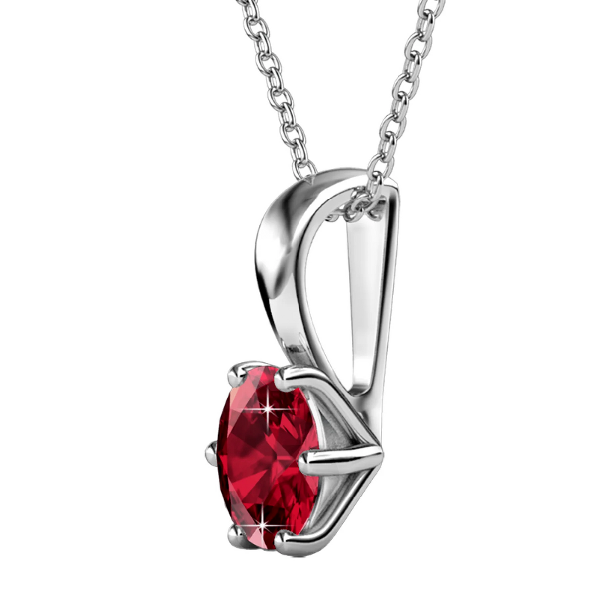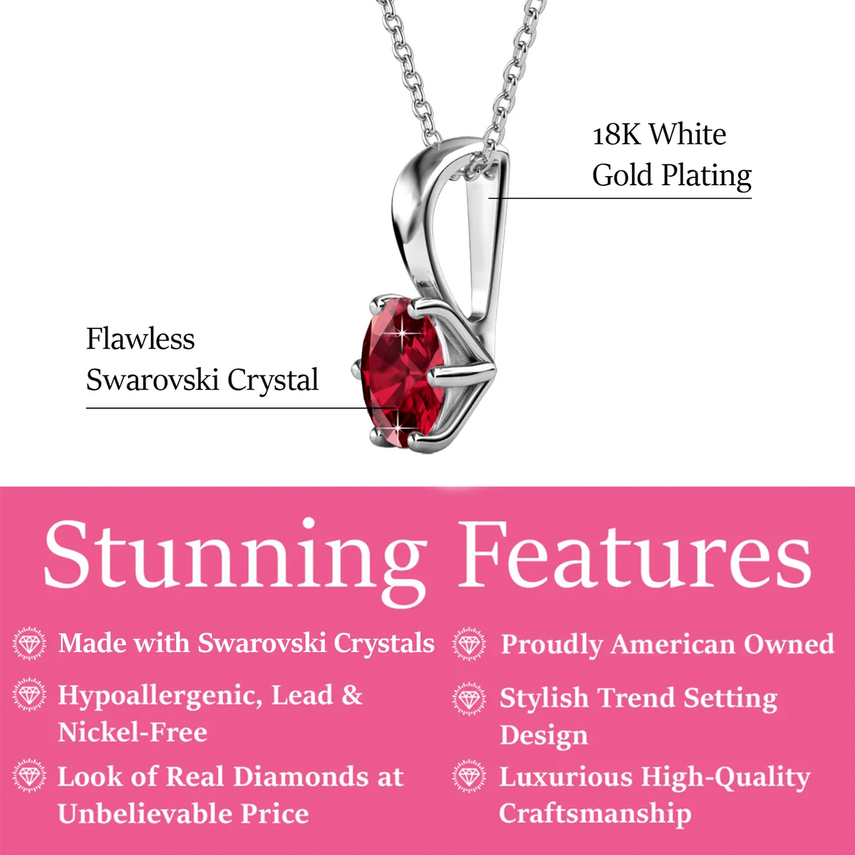 Handcrafted in 18k white gold plated brass with 1 6mm round-cut Swarovski gemstone crystal. Pendant dimensions: 13.2mm x 8mm x 5.68mm. Lobster clasp closure. Hypoallergenic, lead and nickel free. Includes C&C branded gift box. Available in birthstones: Garnet (Jan), Amethyst (Feb), Aquamarine (Mar), Diamond (Apr), Emerald (May), Alexandrite (Jun), Ruby (Jul), Peridot (Aug), Sapphire (Sep), Pink Tourmaline (Oct), Citrine (Nov), Blue Topaz (Dec).
