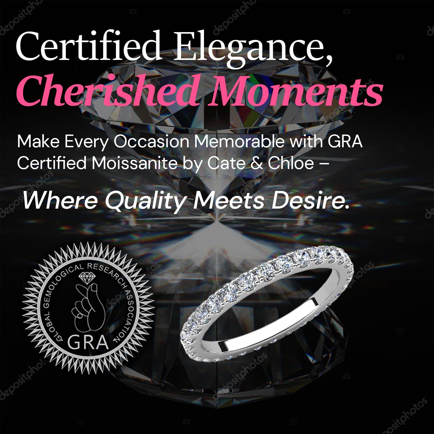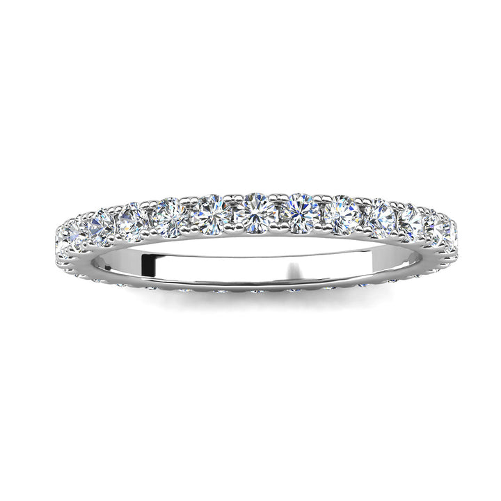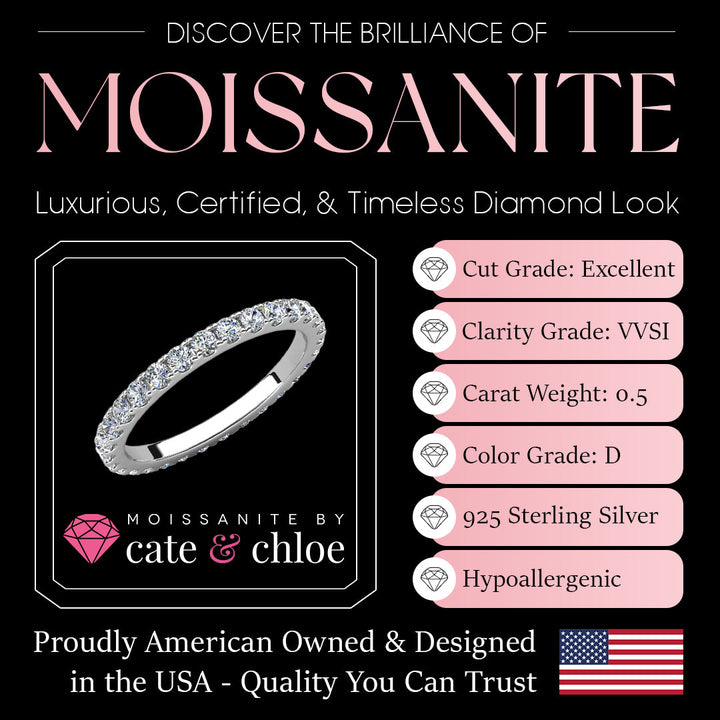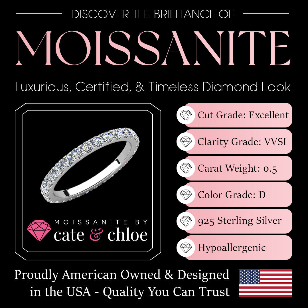 Crafted in 925 Sterling Silver with 18k White Gold Plating. Set with 30 moissanite accent stones (0.03ct / 2mm each), totaling 0.09tcw. Available in sizes 5 to 8. Hypoallergenic, lead-free, nickel-free. Includes luxury jewelry gift box and GRA Moissanite Certification with Warranty ID Card.
