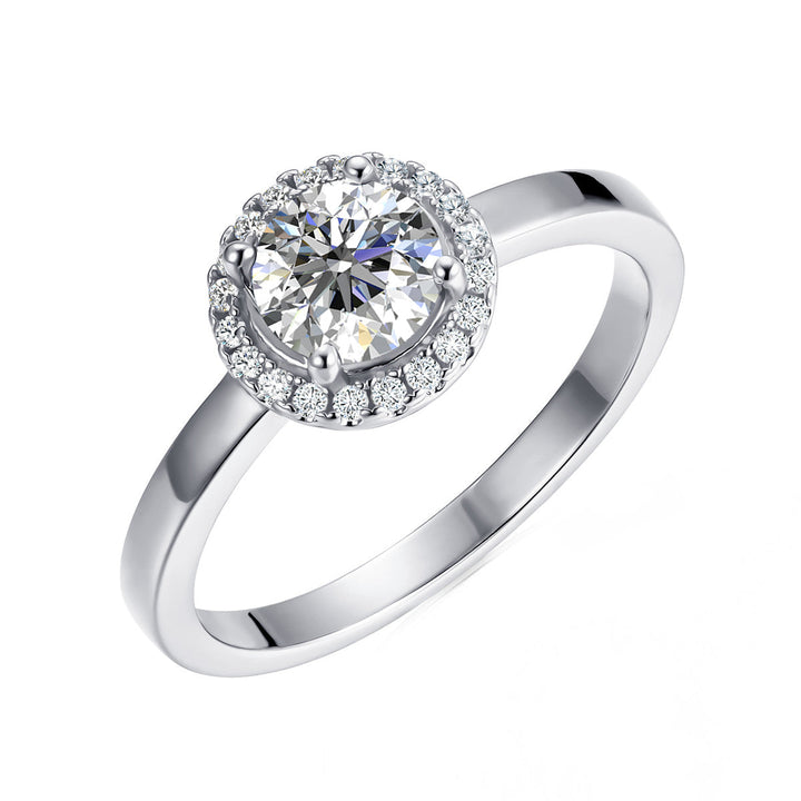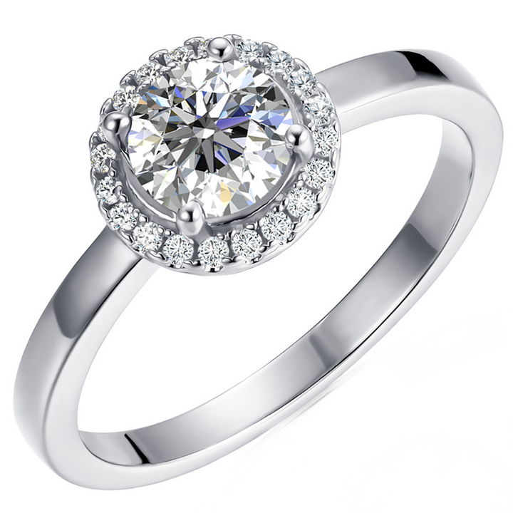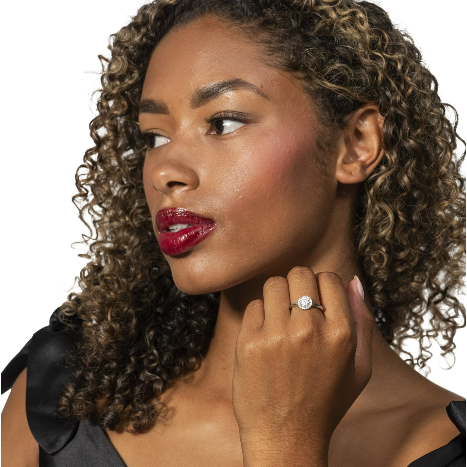 Crafted in 925 Sterling Silver with 18k White Gold Plating. Set with 1 featured moissanite (1ct / 6.5mm) and 19 accent stones. Available in sizes 5 to 8. Hypoallergenic, lead-free, nickel-free. Includes luxury jewelry gift box and GRA Moissanite Certification with Warranty ID Card.