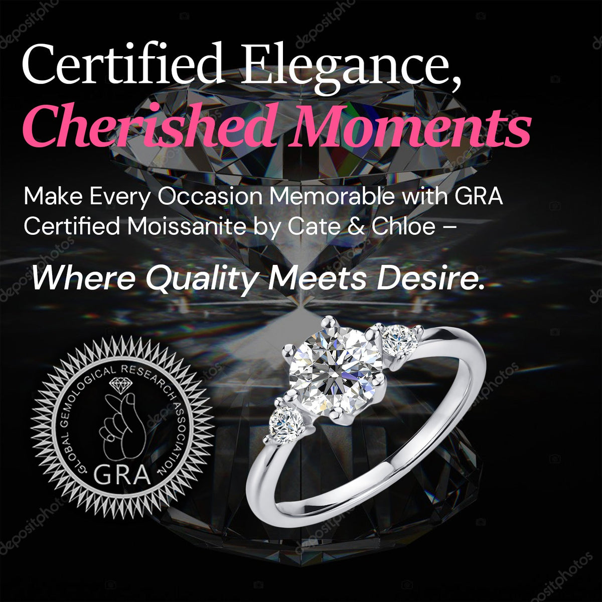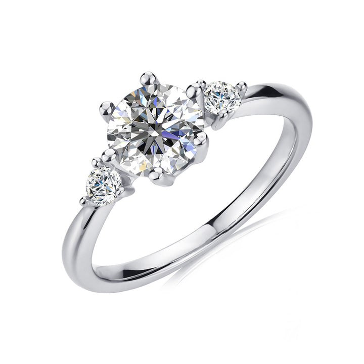 Crafted in 925 Sterling Silver with 18k White Gold Plating. Set with 1 round-cut moissanite (1ct / 6.5mm) and 2 accent stones. Available in sizes 5 to 12. Hypoallergenic, lead-free, nickel-free. Includes luxury jewelry gift box and GRA Moissanite Certification with Warranty ID Card.