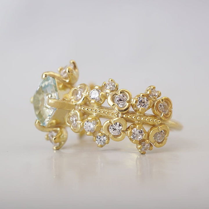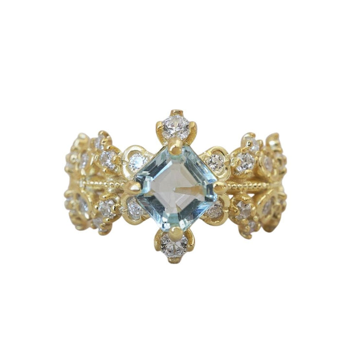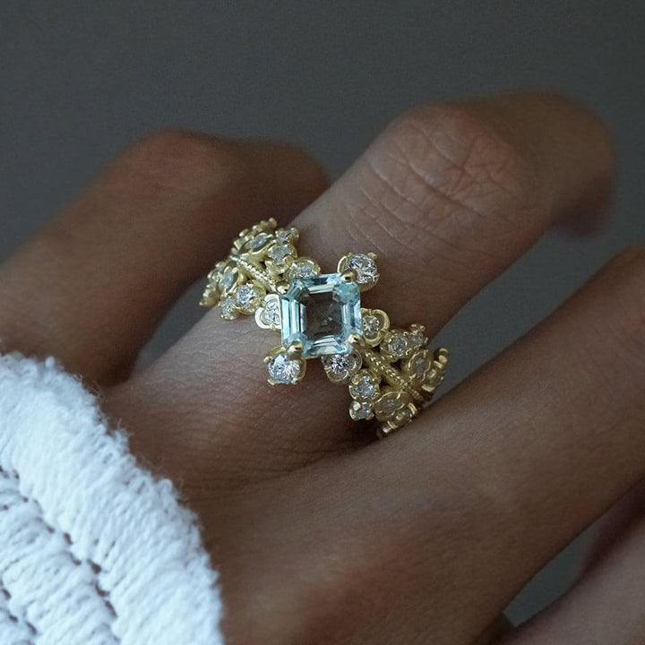 Be whisked away by the heavenly beauty of this Aquamarine Reverie Diamond Ring. Featuring a luxurious aquamarine asscher cut stone paired with natural diamonds set along milgrain details. Its breathtaking design and shimmer will transport you to a blissful daydream.