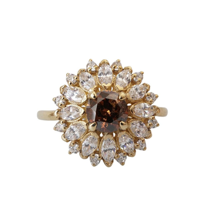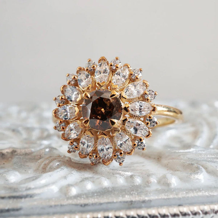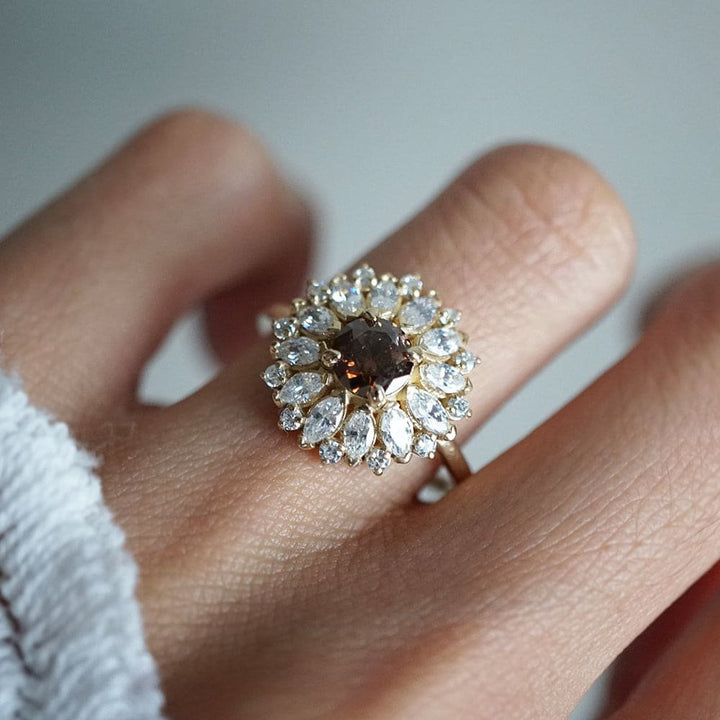 The 'Dandelion Champagne Diamond' ring features a rare dark champagne diamond. Its color makes for a jaw-dropping engagement & ceremonial ring. Surrounded by 12 natural marquise diamonds halos and round white diamonds, creating this stunning dream ring. Handcrafted in your choice of 14K or 18K solid yellow gold, white gold, and rose gold. The champagne diamond shown in the photos is the exact one you'll receive.