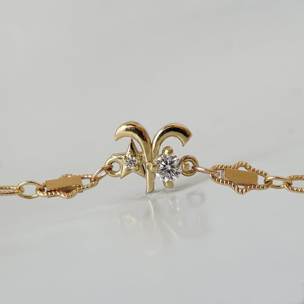 Stories written in the stars. A beautiful horoscope sign and birthstone sits on a delicate gold-filled chain. The birthstone for Aries is the Diamond. The Zodiac sign of Aries also responds to Aquamarine.