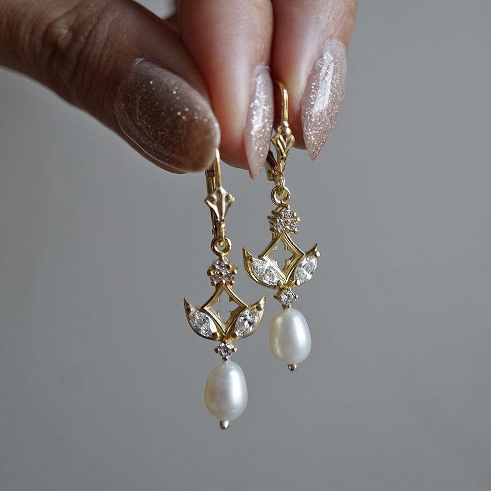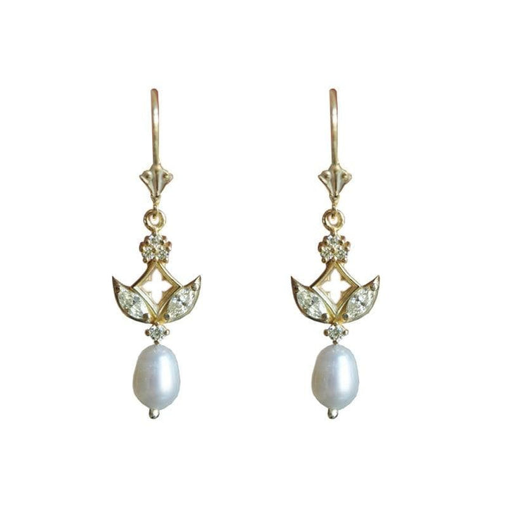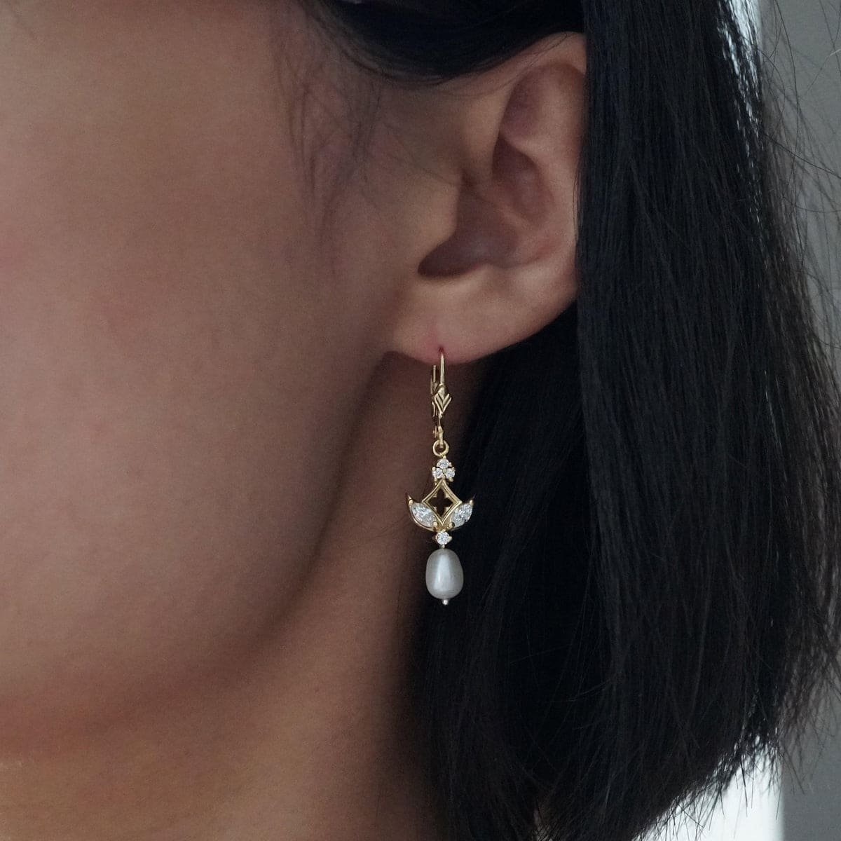 The Midnight Dream Pearl Earrings was inspired by the rose windows commonly found in gothic architecture. With its round arches and pointed tips, this beauty is embellished with two natural pearls and CZ. Light weight and sold as a pair.