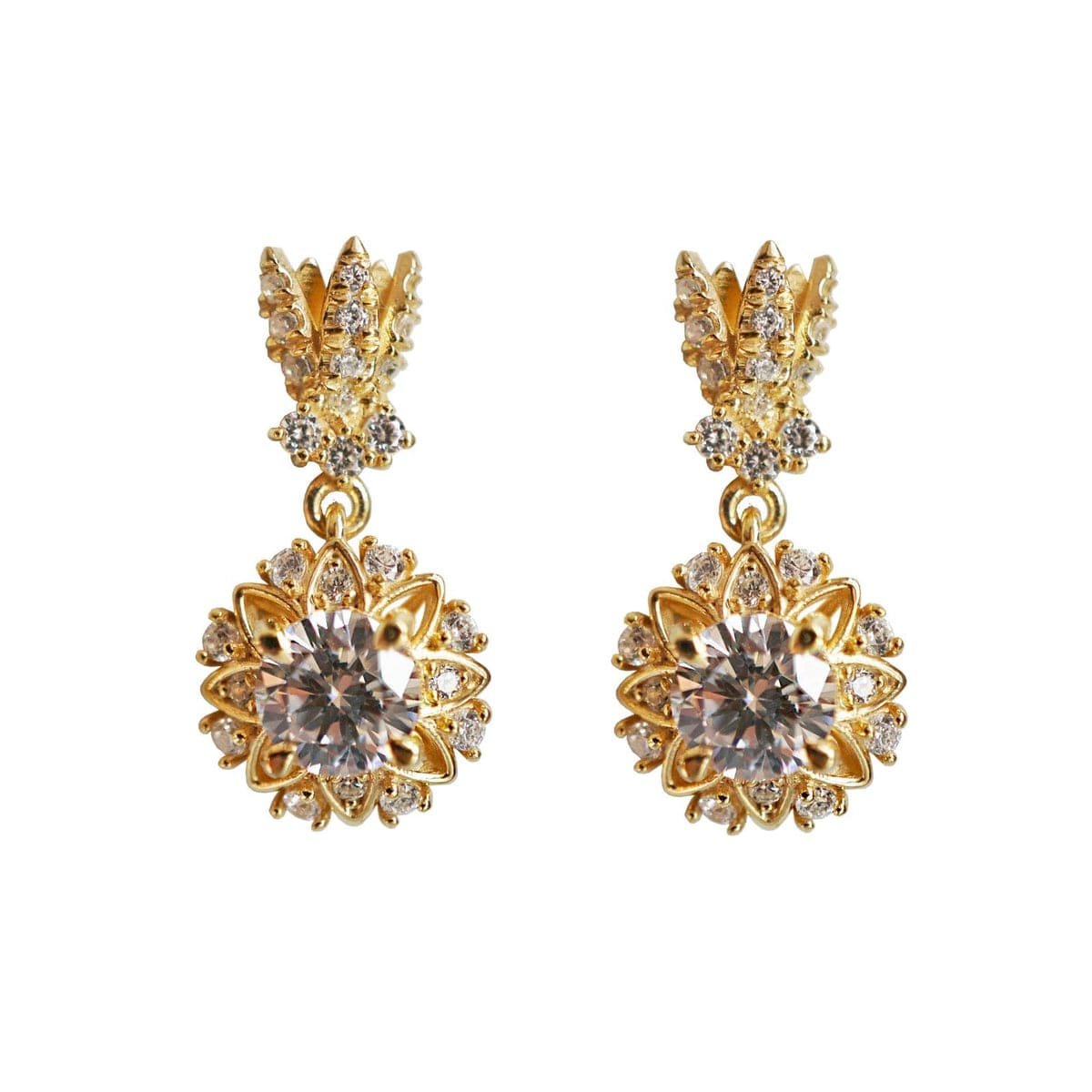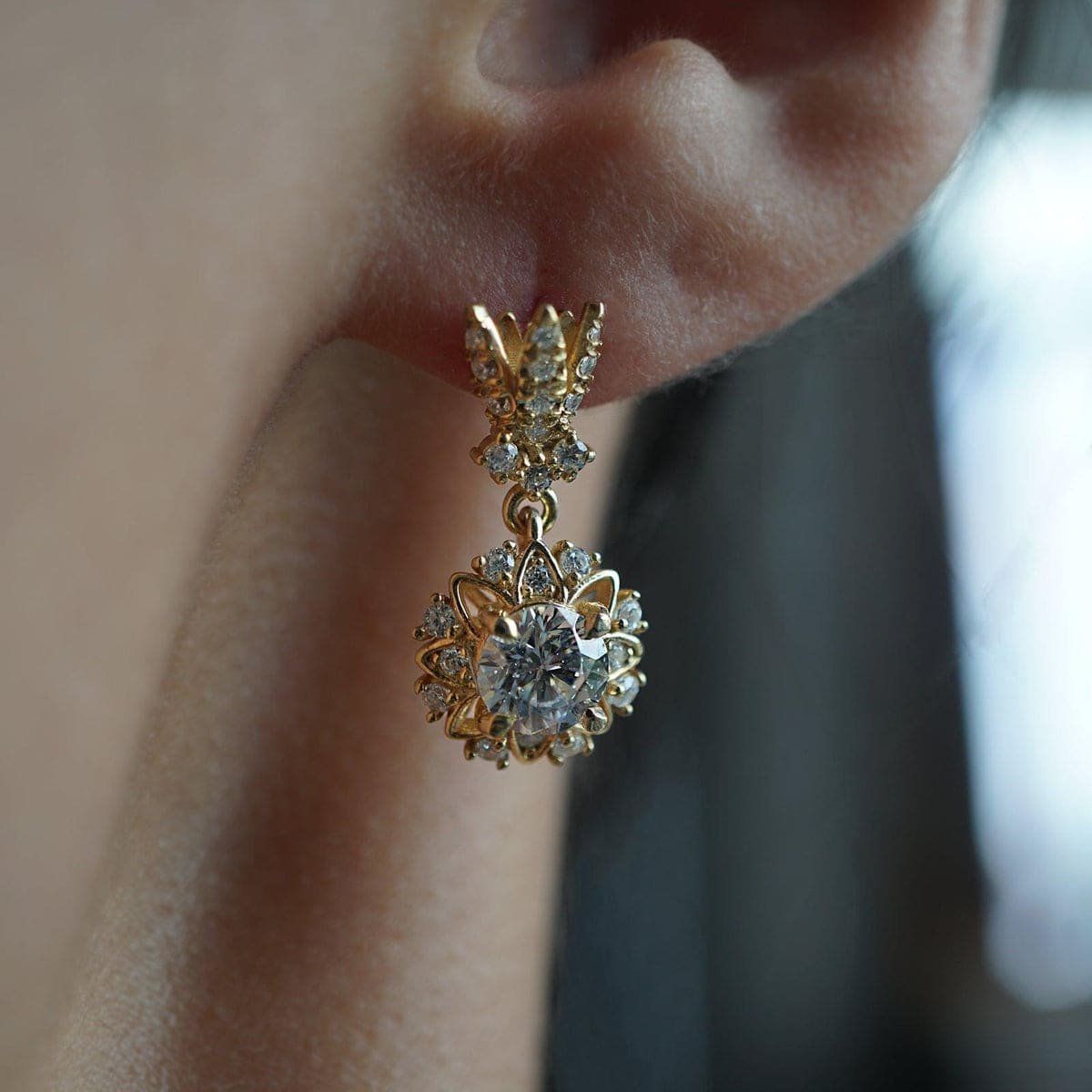 14k yellow gold with 1.6ct moissanite or cubic zirconia center stone, and surrounding cubic zirconia or 0.87ct natural diamonds. Also available in 14k rose or white gold.