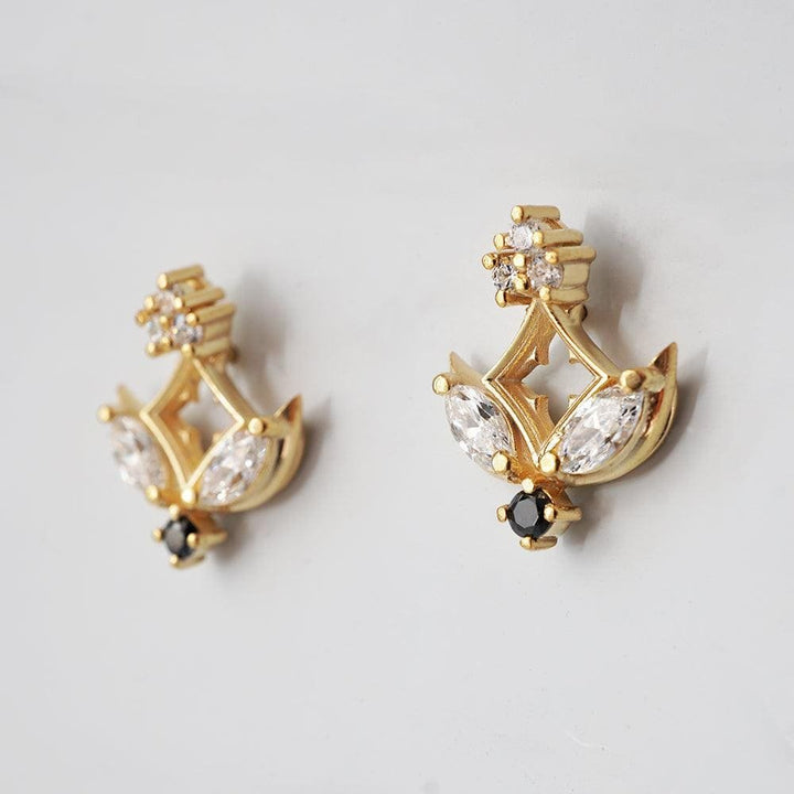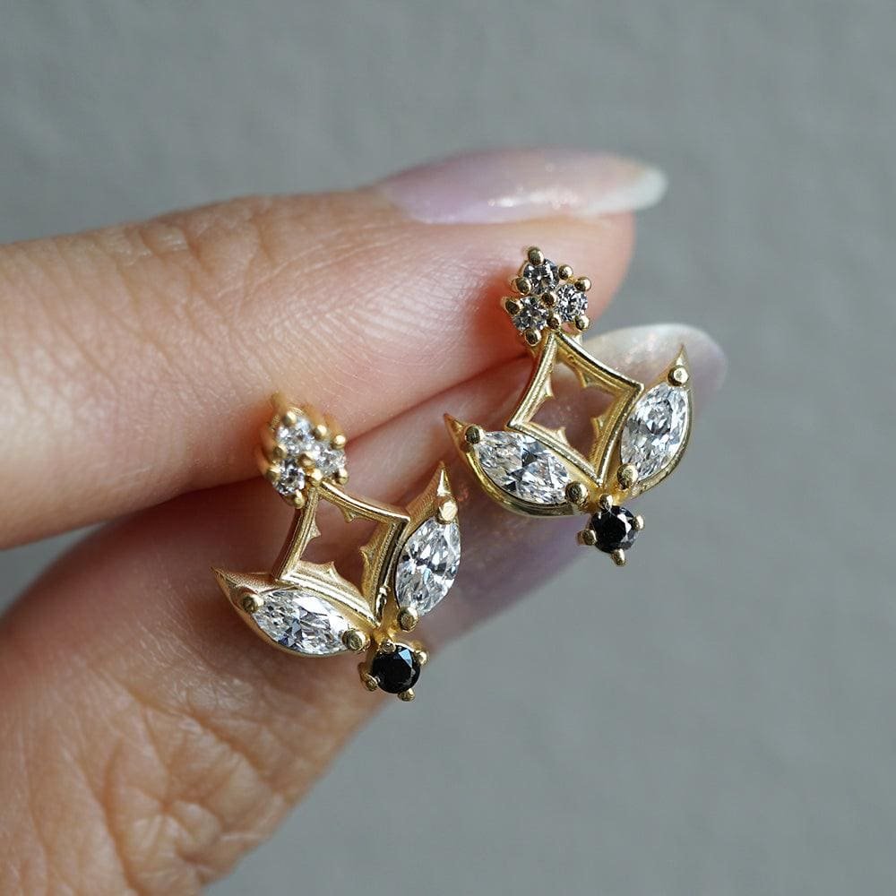 The Black Diamond Gothic Midnight Studs was inspired by the rose windows commonly found in gothic architecture. With its round arches and pointed tips, this beauty is embellished with two natural black diamonds and white CZ. Light weight and sold as a pair.