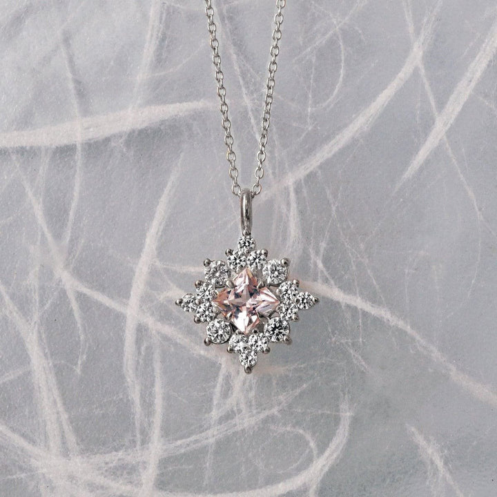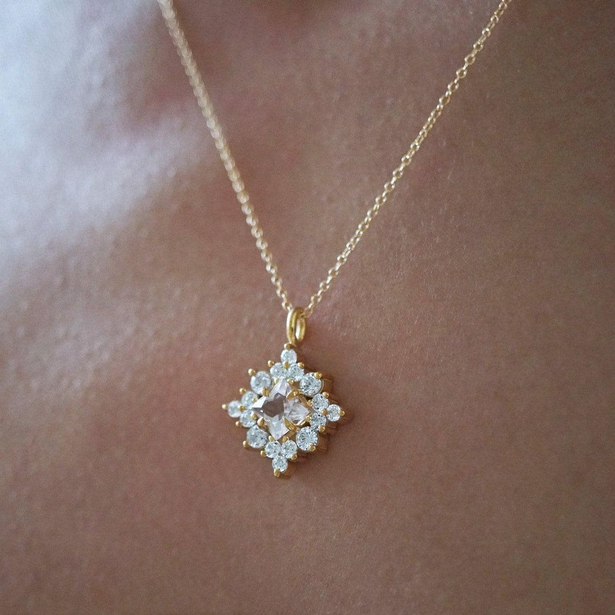 Named after the Aphrodite Goddess, this ring symbolize sexual love and beauty. The Aphrodite woman is graceful, passionate, and possesses a strong seduction about her. The necklace features a natural princess cut morganite center stone, surrounded by natural white diamonds or CZ.