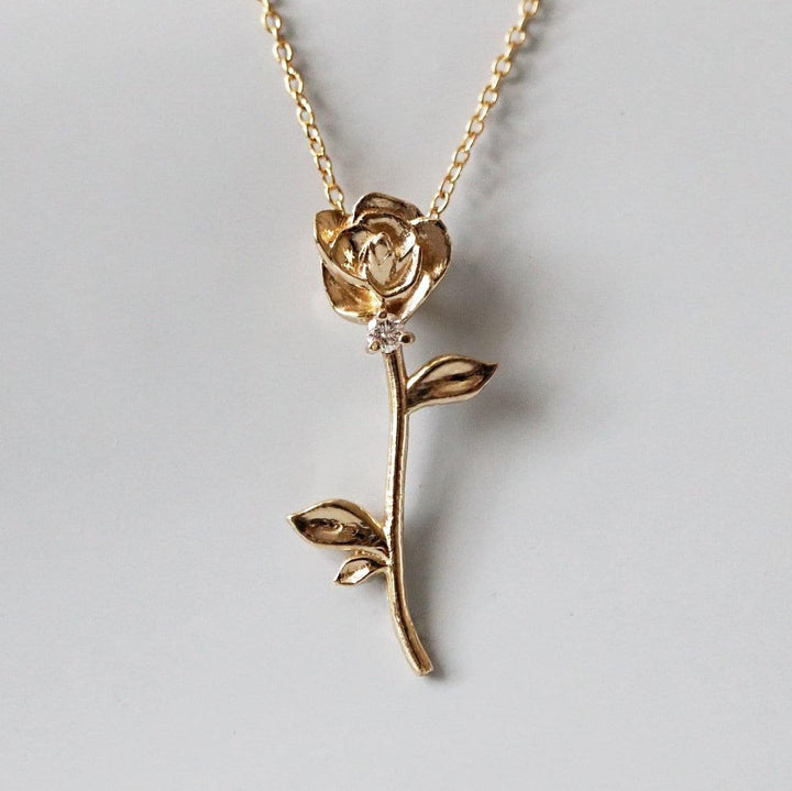 A delicate rose hangs on a fine 14k solid gold filled chain, embellished with a 1.8mm natural diamond. Making it a dainty piece for everyday wear.
