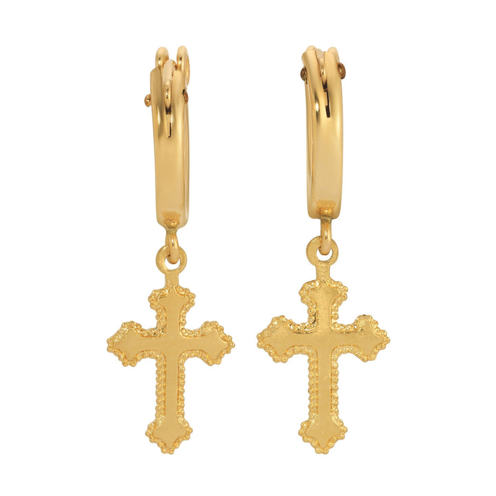 14K gold filled 12mm hoops with 8mm cross charms. Earring length: 2.5 inches.