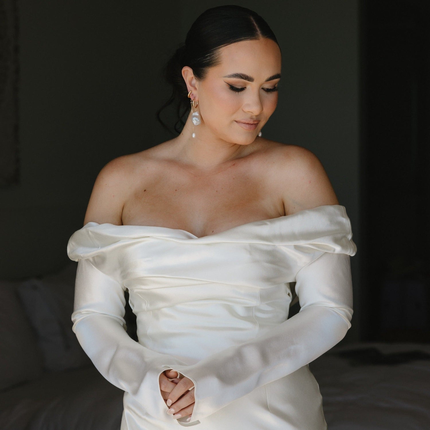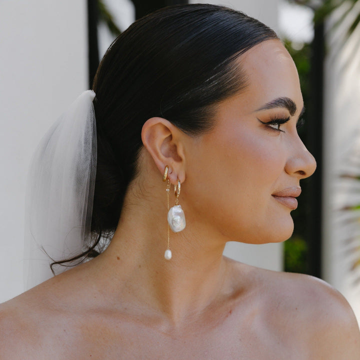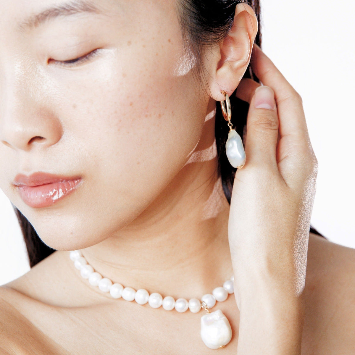 The Riviera Pearl Hoops by Erin Fader are graceful yet striking, featuring baroque pearl charms that shimmer with individuality. With hand-wrapped 14k gold fill wire and a classic hoop shape, these earrings bring beachside sophistication to your everyday look.