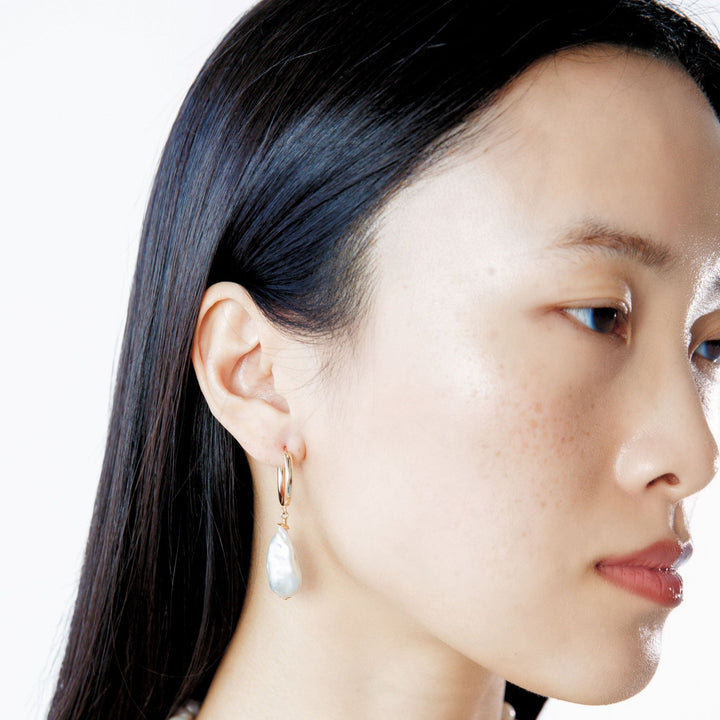 14k gold filled hoops, 23x19mm. Two flat baroque pearl charms, each unique. Waterproof and hypoallergenic.