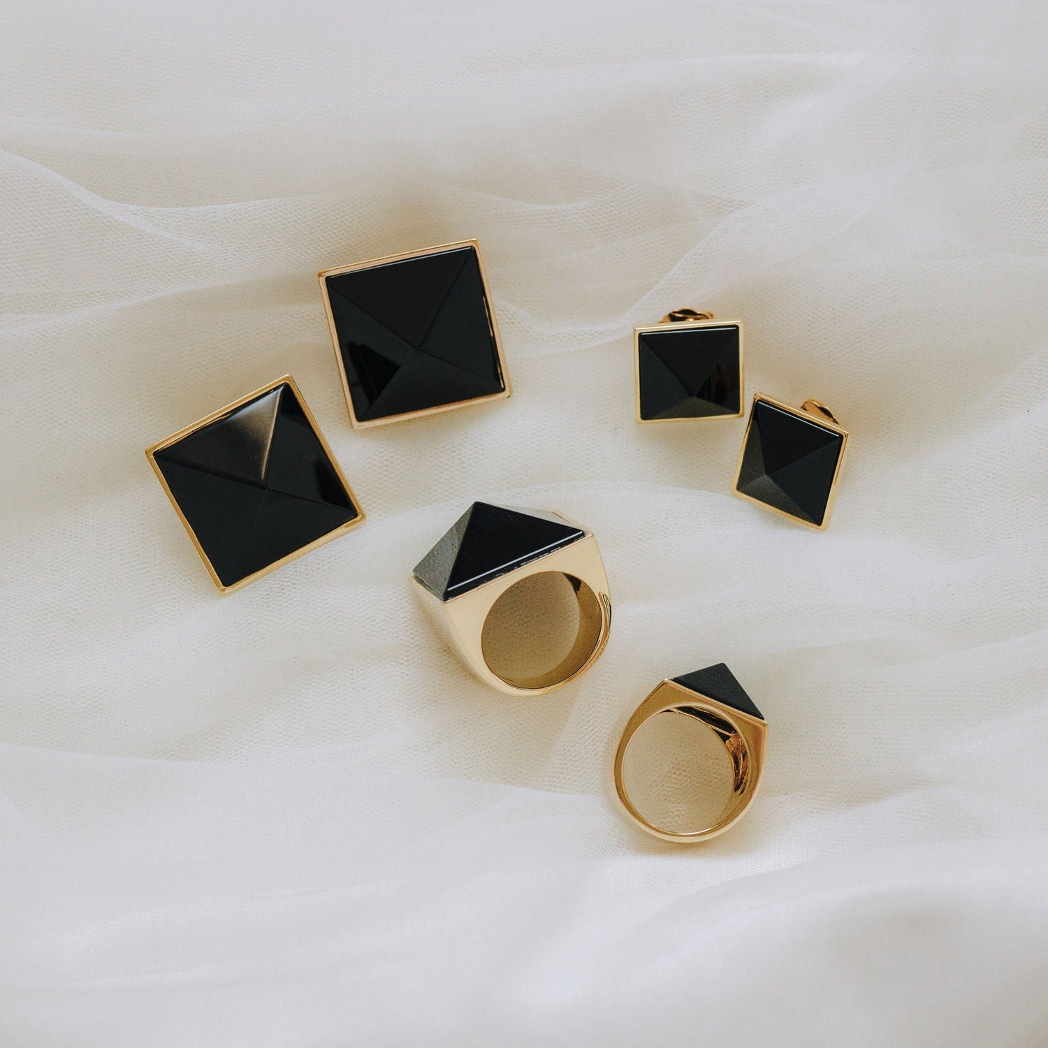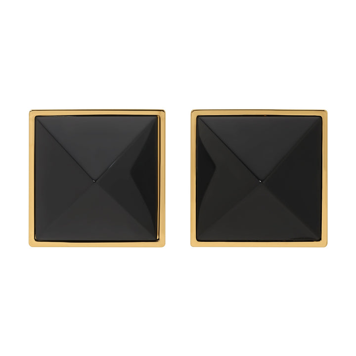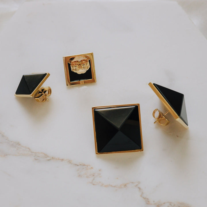 These Pyramid Studs - Onyx Grande by Erin Fader make a fierce and elegant statement. Crafted in a bold, architectural silhouette, they feature genuine Onyx gemstones carved into dramatic pyramid shapes. Their high-shine gold finish and medium weight create an empowered, luxurious look that’s both edgy and refined. A standout piece for those who favor bold energy and grounded elegance. Each onyx stone varies in hue and texture, making every pair unique.