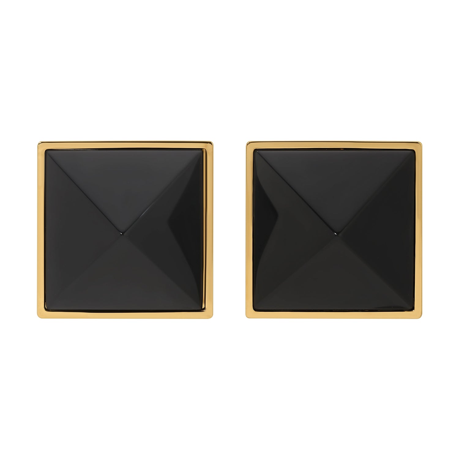 Heavily plated 18k gold over brass with genuine onyx gemstones. Each stud measures 24×24×8mm and weighs 11g. Post back closure with 9mm comfort backing. Water resistant and hypoallergenic.