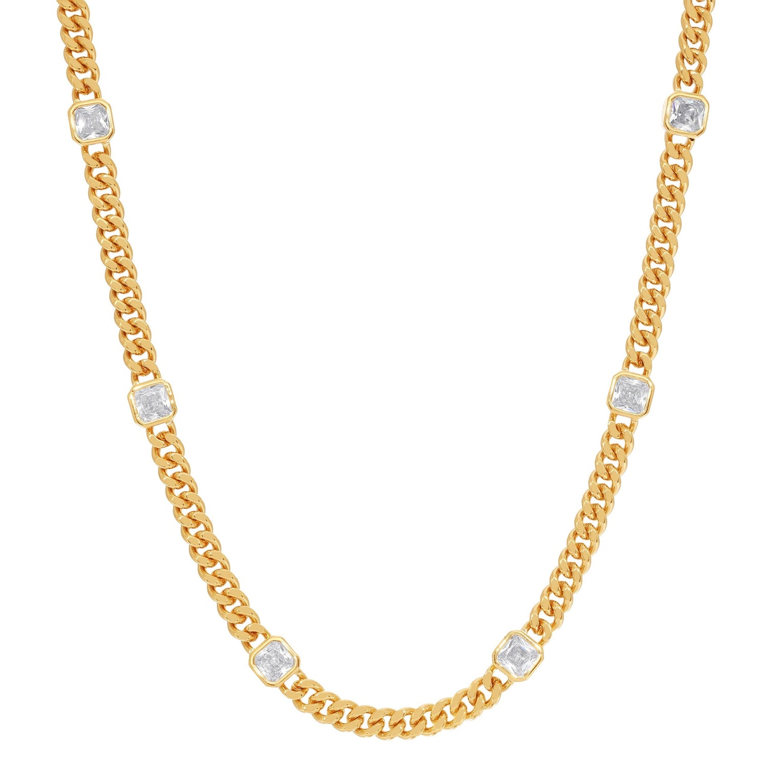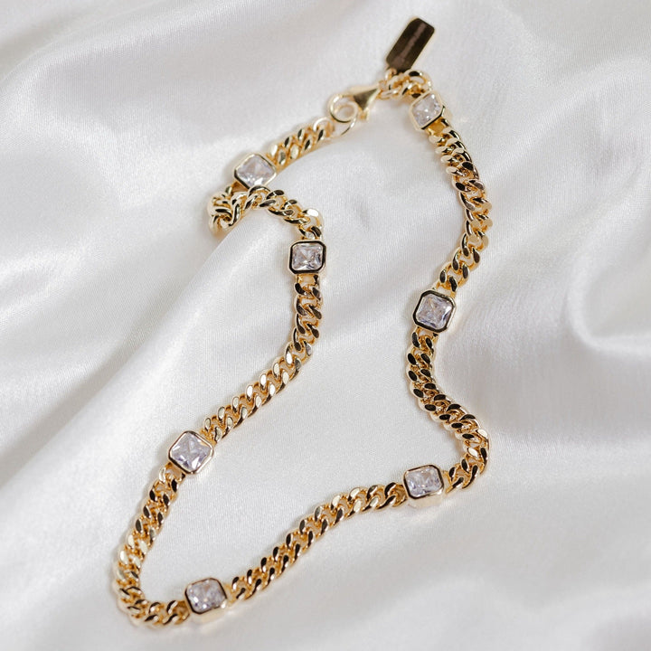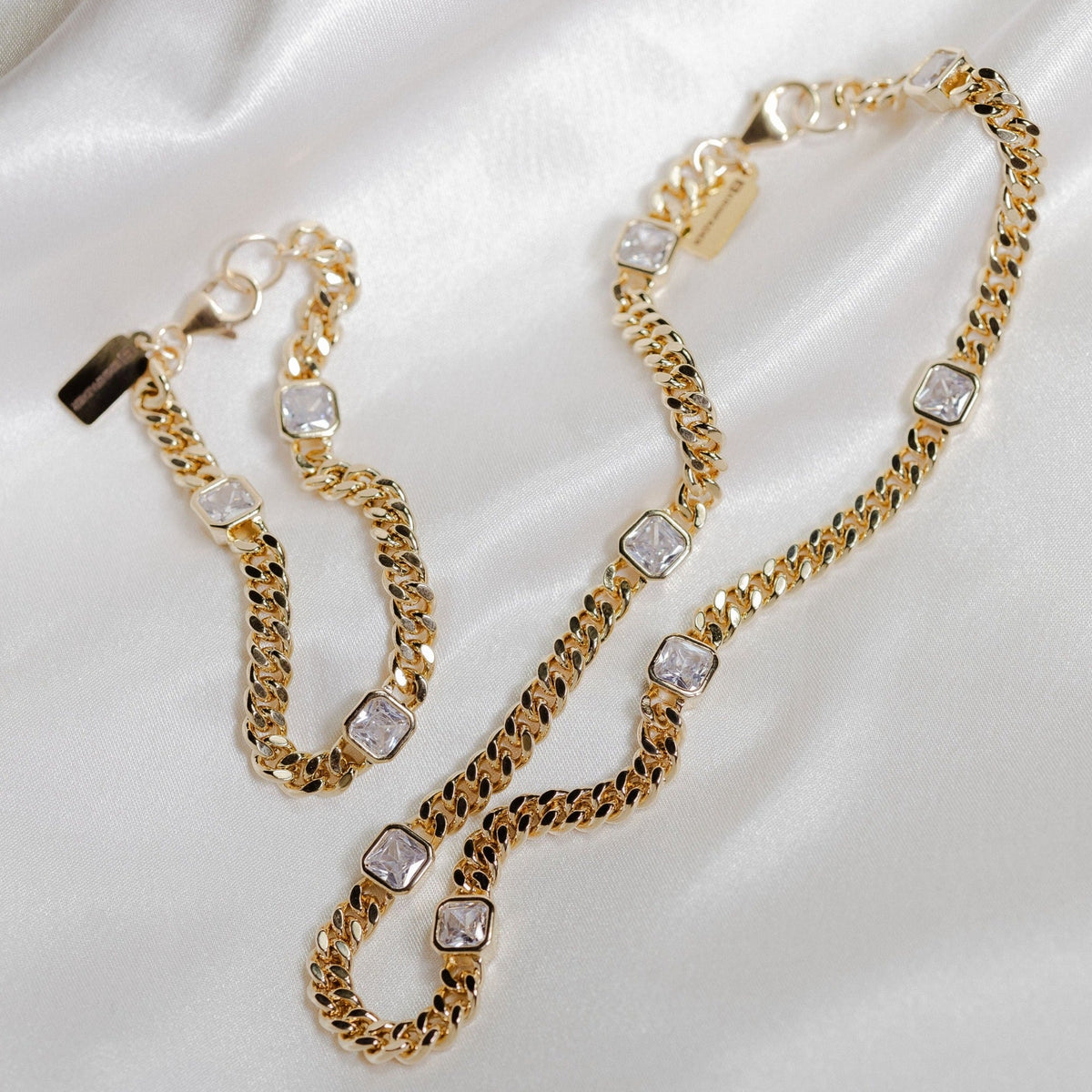Heavily plated 24K Gold Overlay over brass. Measures 14 inches with 2-inch extender. Cubic zirconia studded. Water resistant.