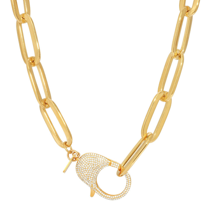Chain crafted with 24k gold overlay over brass, pendant inlaid with crystal Cubic Zirconia. Chain length: 18.5', width: 15mm. Clasp: 1.5' wide. Water resistant.