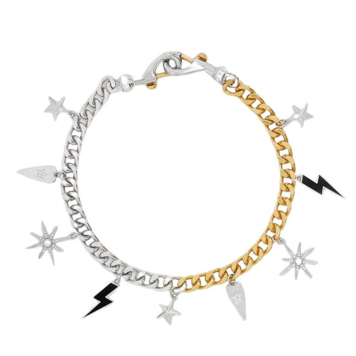 Rebecca Minkoff is a renowned American fashion designer celebrated for her contemporary and edgy designs. Born in San Diego, California, Minkoff gained widespread recognition for her iconic handbags, featuring distinctive hardware and luxurious materials. Her brand expanded to include ready-to-wear clothing, footwear and accessories. Minkoff is a prominent figure in the fashion industry, known for her innovative approach and commitment to creating accessible luxury for the modern, confident woman.Style notes: The Celestial Charm Necklace is a captivating fusion of celestial inspiration and rebellious charm. Necklace features multi-colored hardware in antique brass, black, and silver, creating a celestial symphony that effortlessly complements any outfit.Price: Please note price may vary due to exchange rate differences or shipping, duties and taxes. Price may also vary with materials choice. Final price is calculated at checkout at the designer's website. Materials: Gold-plated brass and silver.
