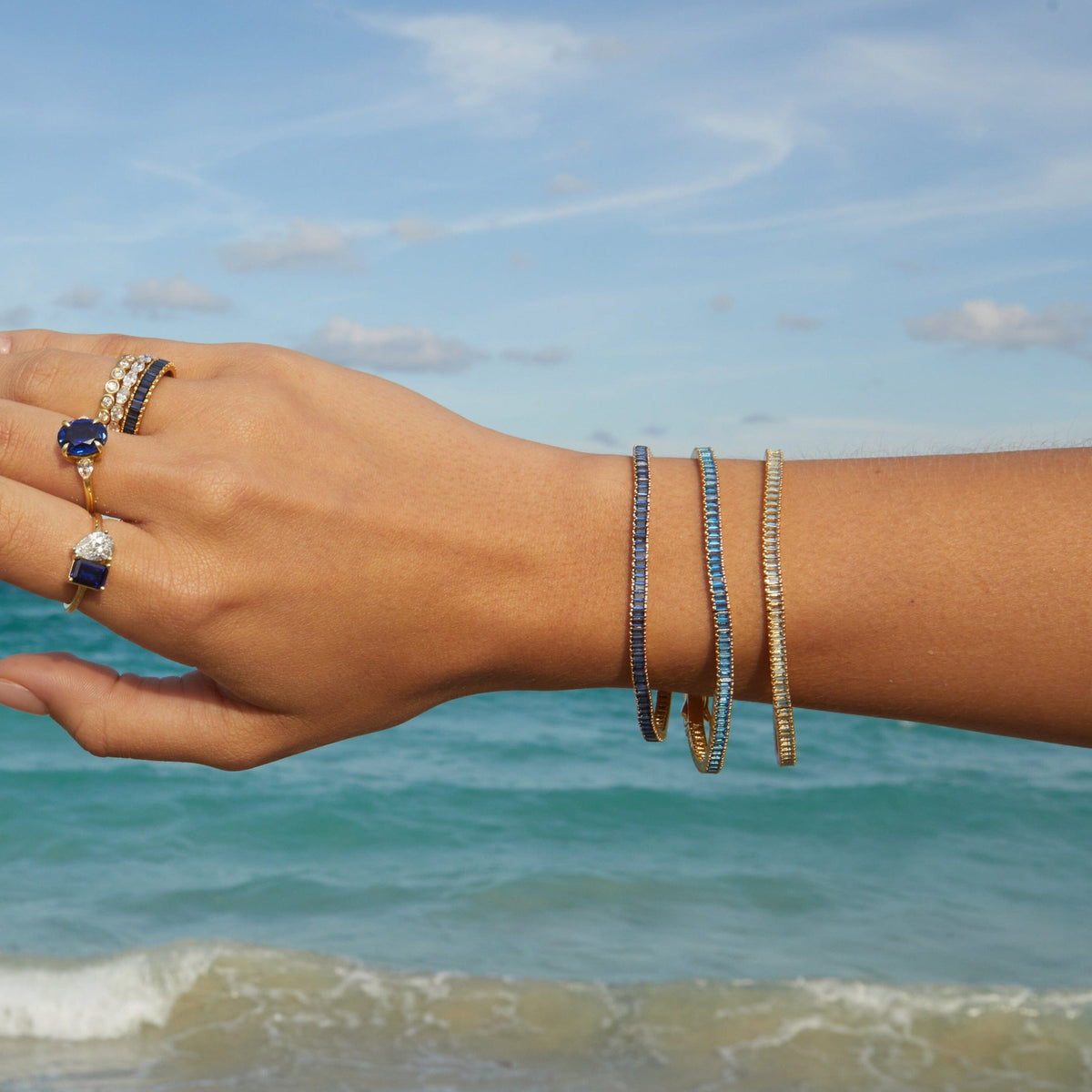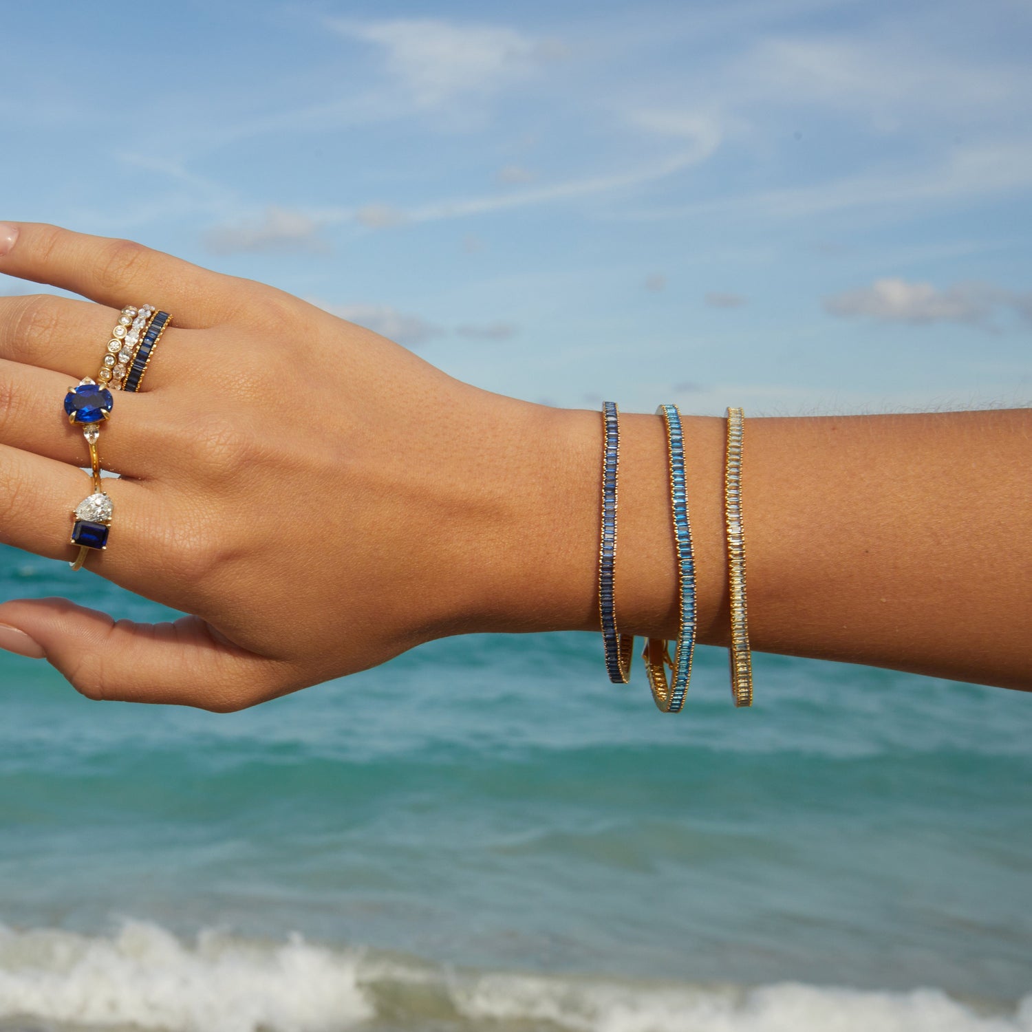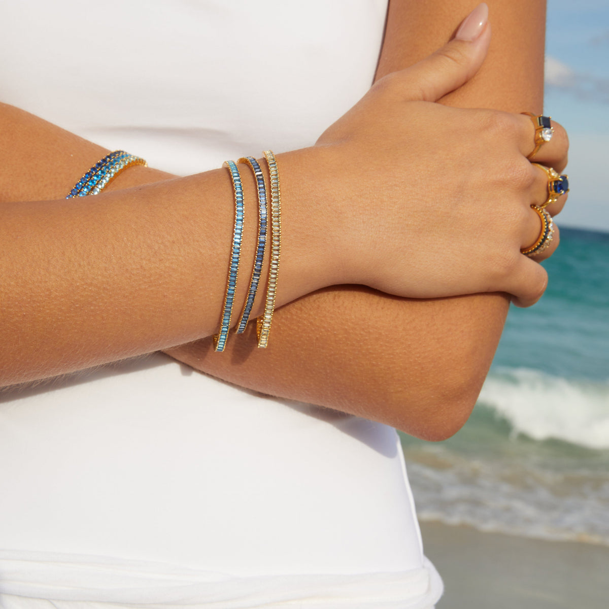 This Lab Grown Aquamarine Baguette Tennis Bracelet by Aurate channels modern romance through its clean lines and soothing blue hue. Set in gold vermeil, the aquamarine stones create a stunning flow of icy elegance—ideal for stacking or solo wear.