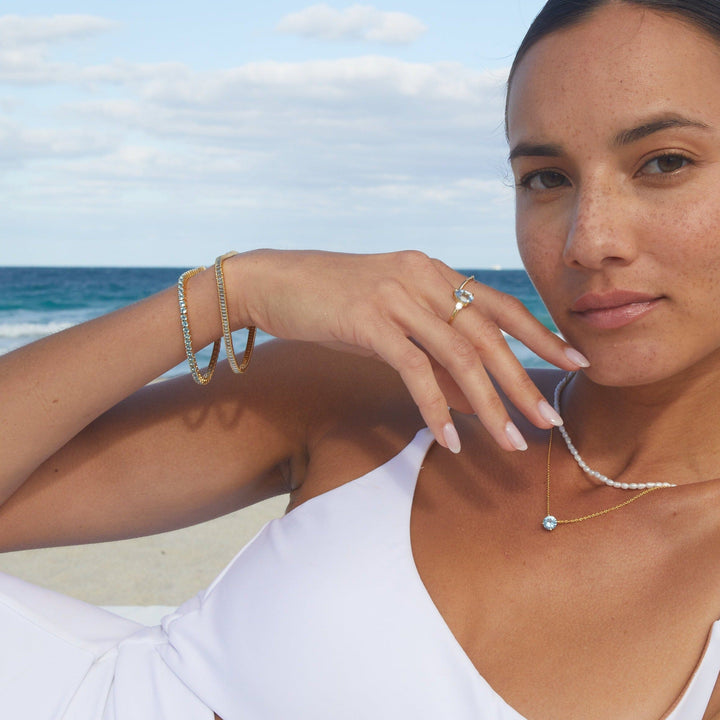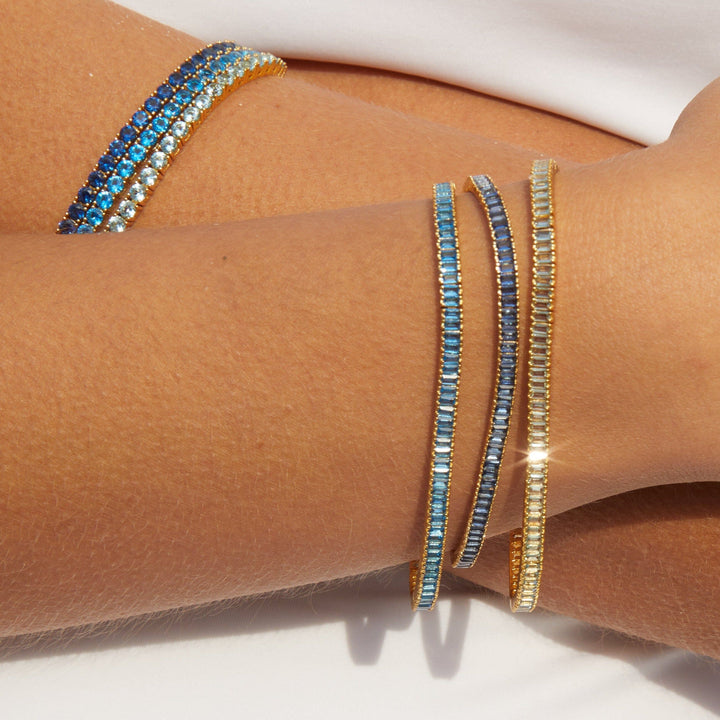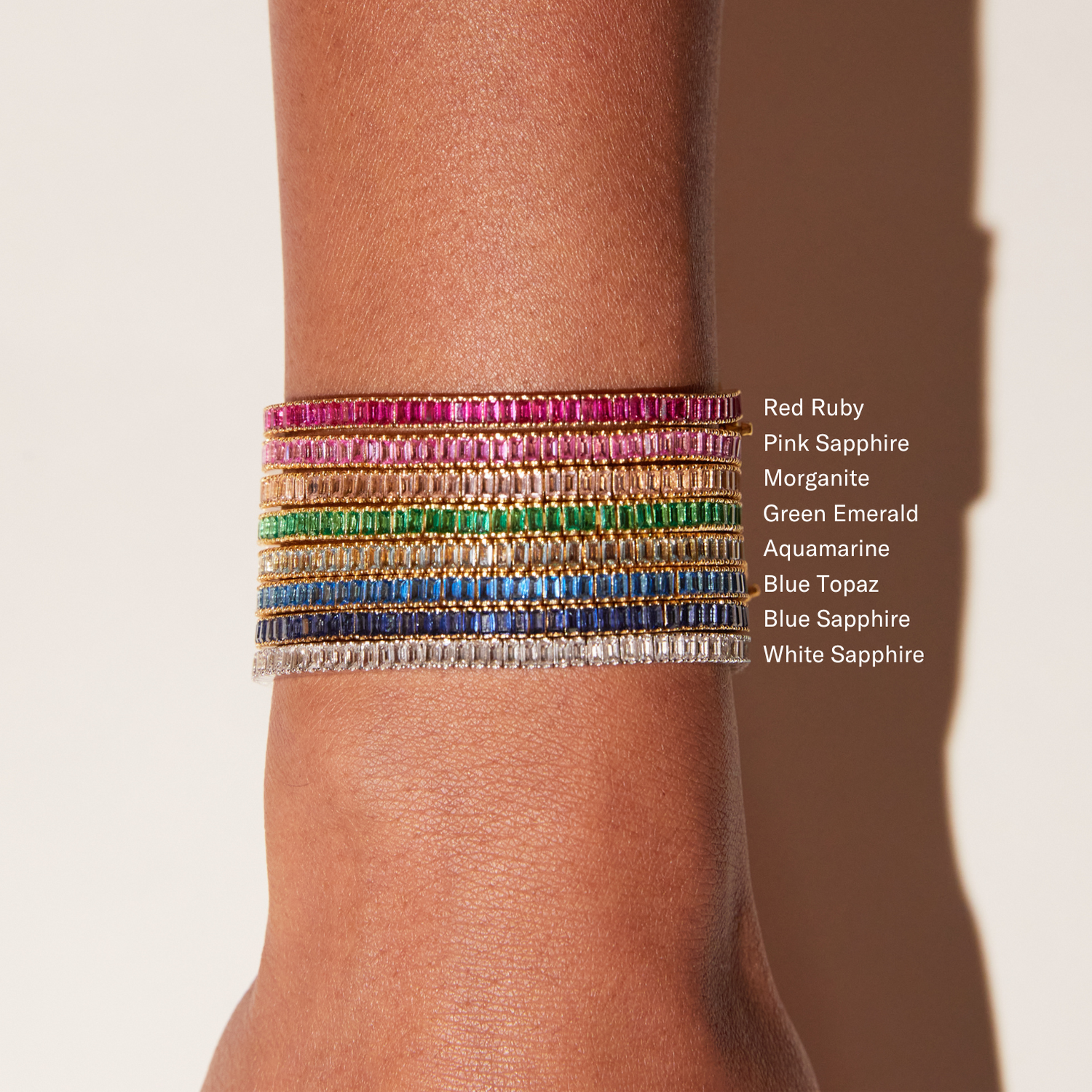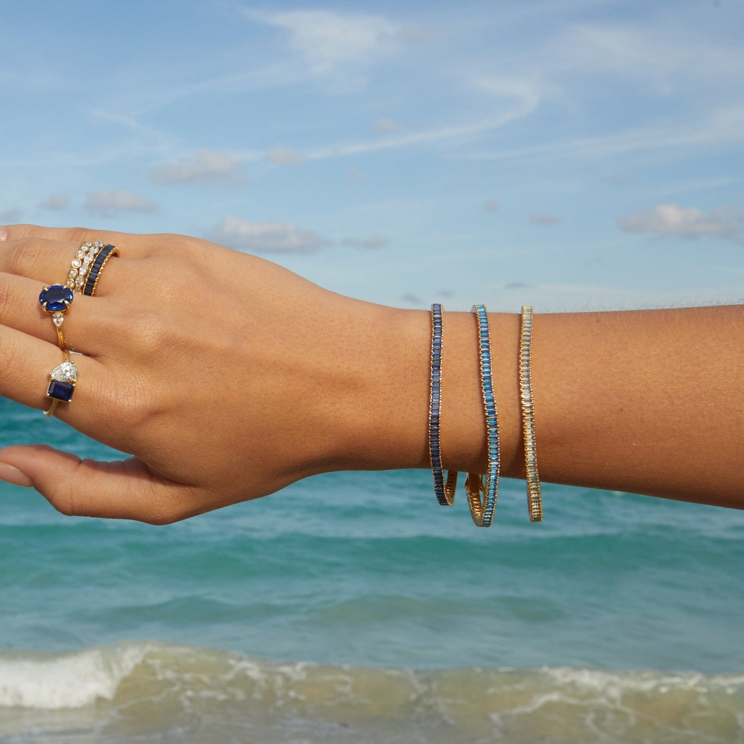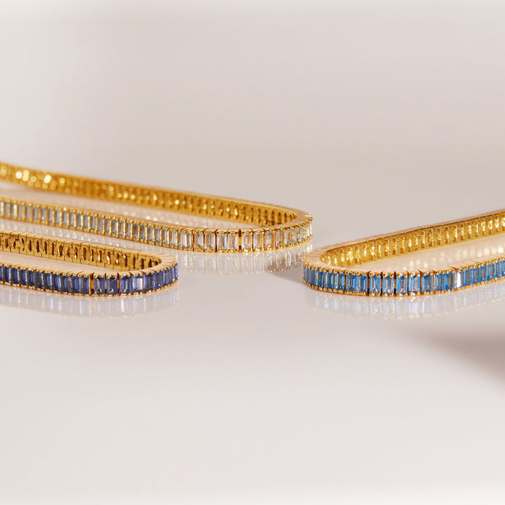 This Lab Grown Aquamarine Baguette Tennis Bracelet by Aurate channels modern romance through its clean lines and soothing blue hue. Set in gold vermeil, the aquamarine stones create a stunning flow of icy elegance—ideal for stacking or solo wear.