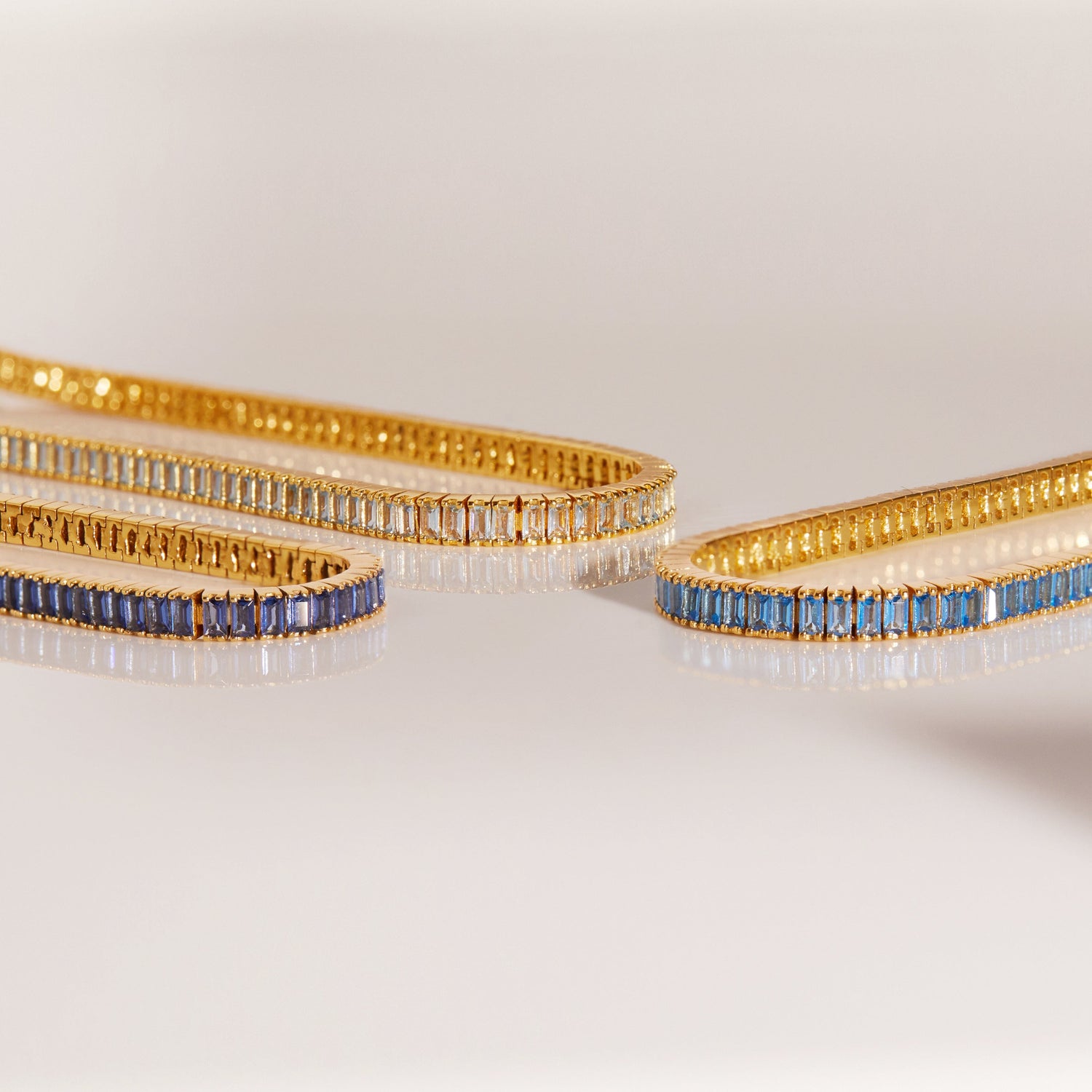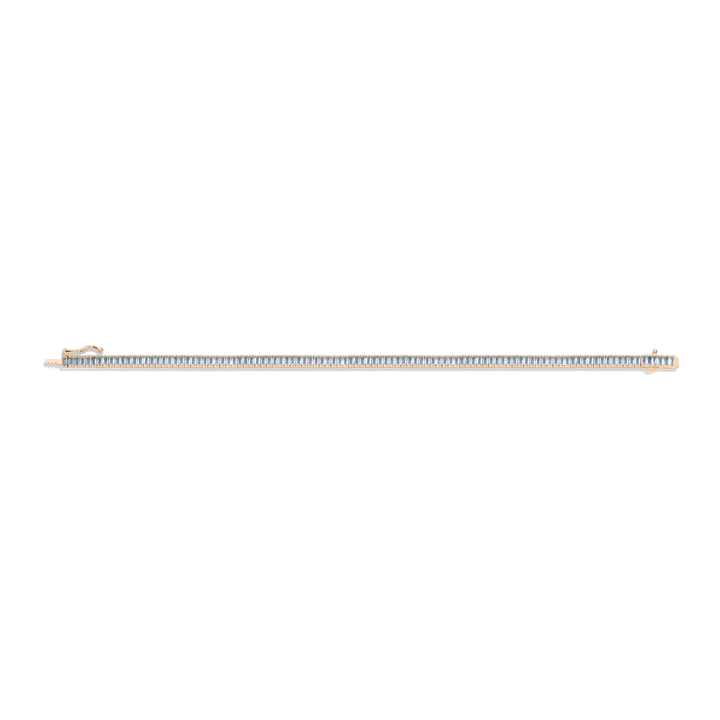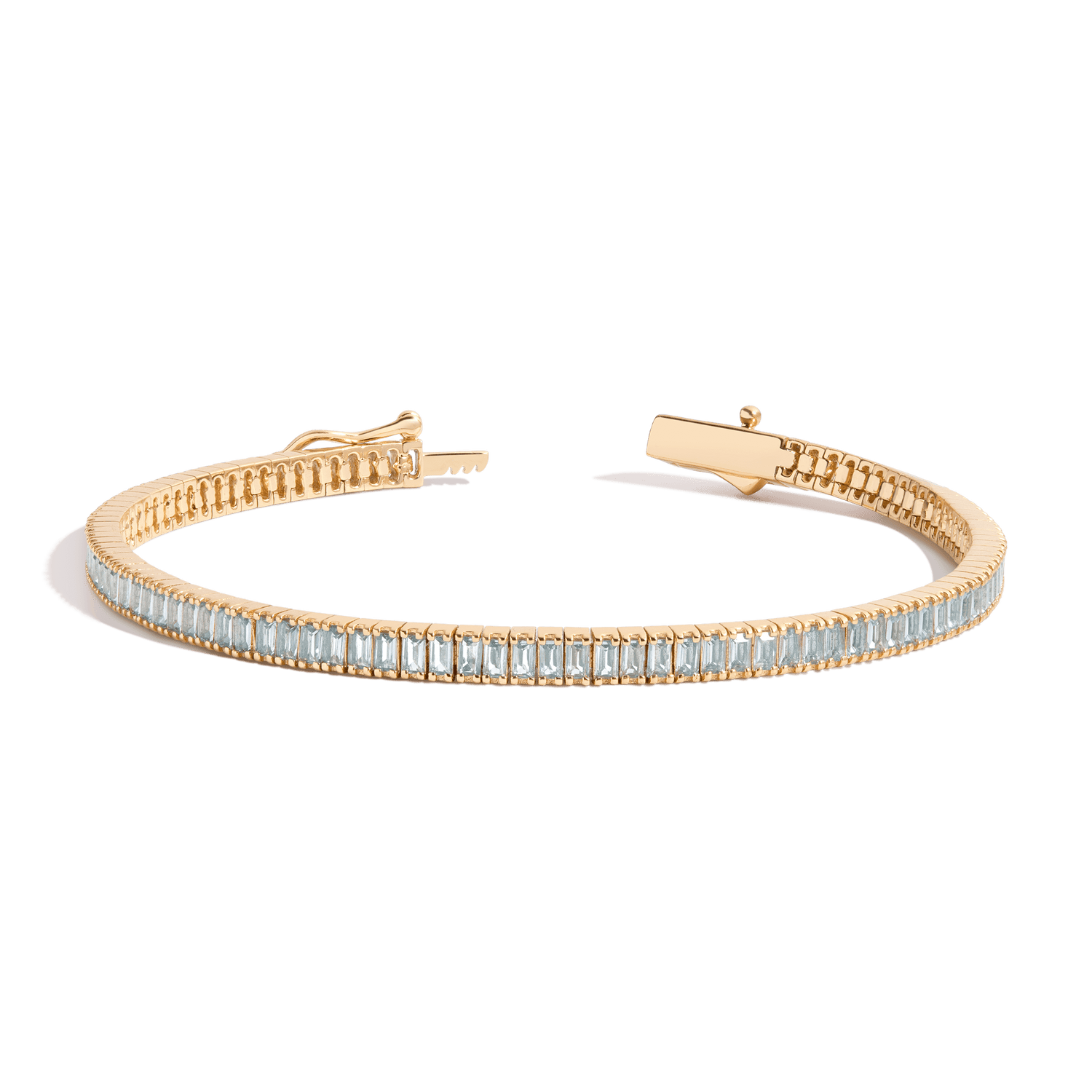 Handcrafted in vermeil with AAA lab grown aquamarine baguettes (2.5x1.5mm), totaling 6 carats. Width: 3.1mm, thickness: 2mm. Length: 6.5' or 7'. Weight: 11.6g. Prong setting with box clasp and safety hook.