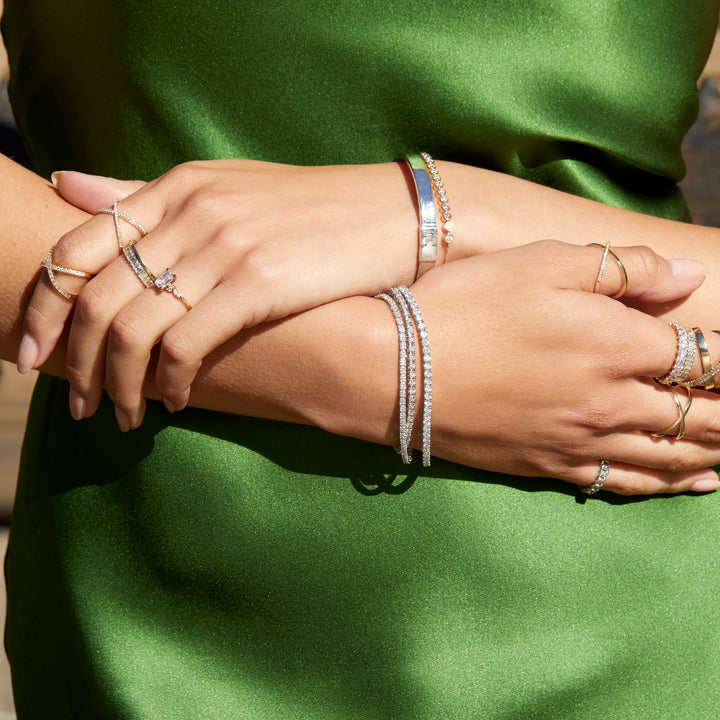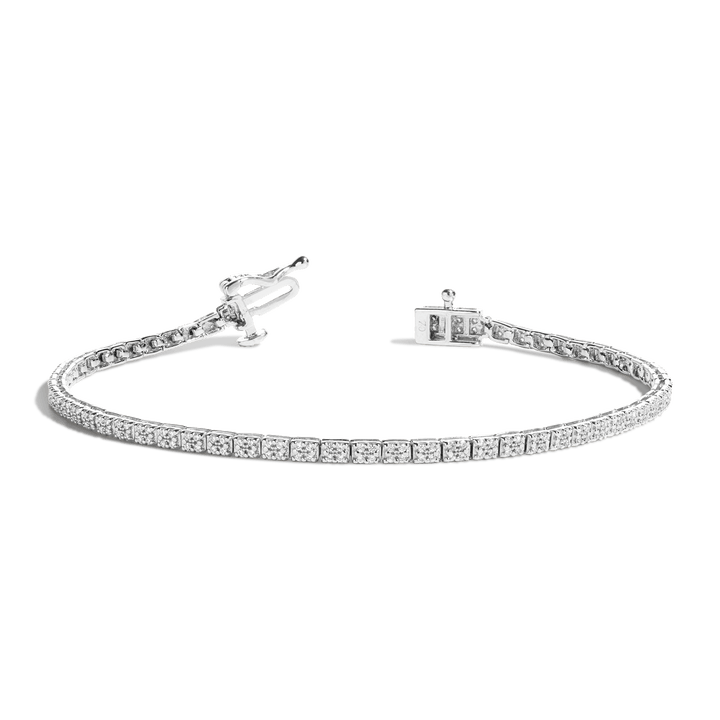 These Diamond Cluster Tennis Bracelets by Aurate bring a refined yet contemporary twist to a jewelry classic. With over 200 round brilliant diamonds arranged in tight clusters, the piece captures the beauty of movement and light, offering a radiant sparkle with every gesture. Designed for those who appreciate both tradition and innovation, this bracelet radiates elegance and intention. Its versatile sizing ensures a tailored fit, and the subtle box clasp offers both security and seamless polish. An embodiment of grace and glamour, this bracelet is the perfect blend of ethical luxury and timeless design.