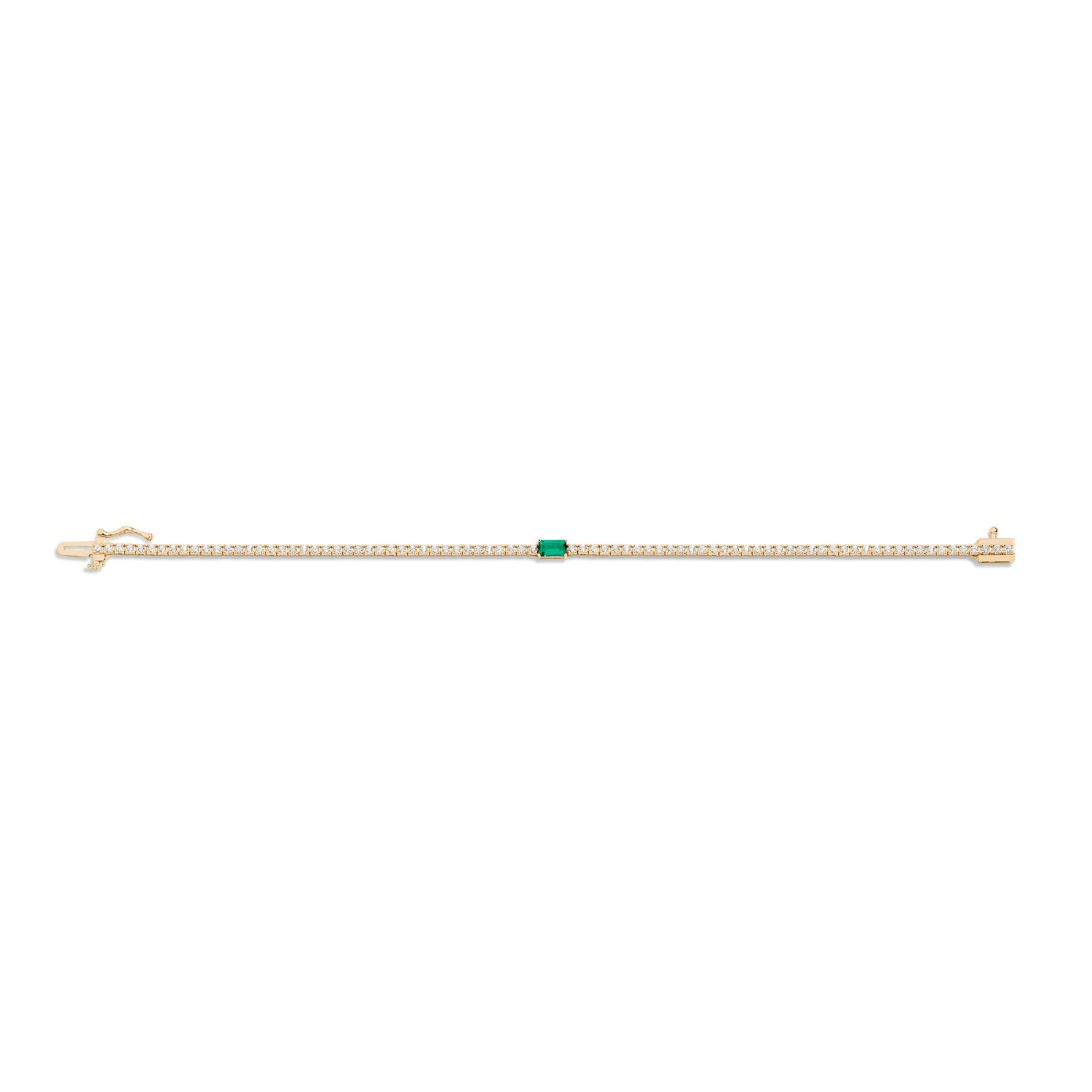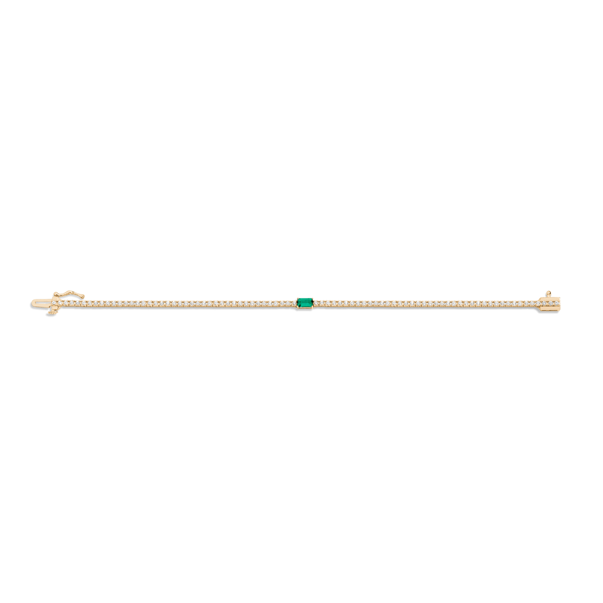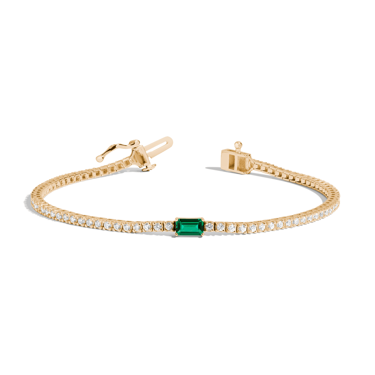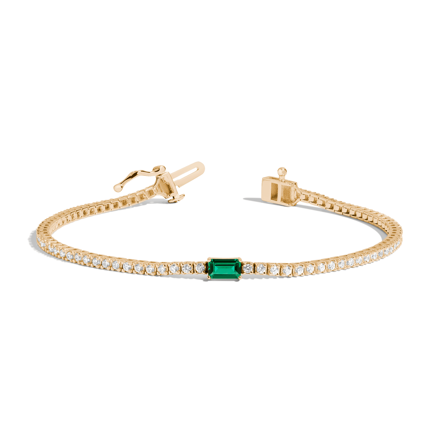 This Lab Grown Diamond Tennis Bracelet with Emerald by Aurate in 18k delivers the same iconic design in a richer gold tone. A vivid green emerald anchors a bracelet of lab-grown diamonds for effortless, classic sophistication.