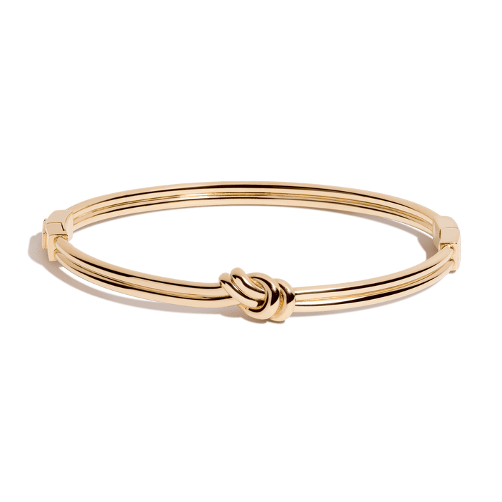 This Gold Knot Hinged Bracelet by Aurate is a timeless ode to unity and enduring love. Its textured knot detail symbolizes unbreakable bonds, while the modern hinge mechanism ensures both comfort and style. Crafted from recycled gold, this piece merges meaning with elegance, creating a luxurious staple for the wrist.