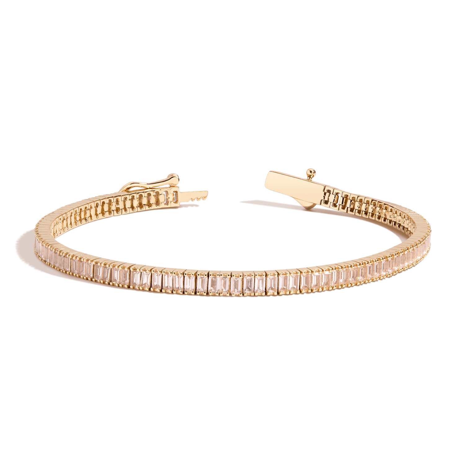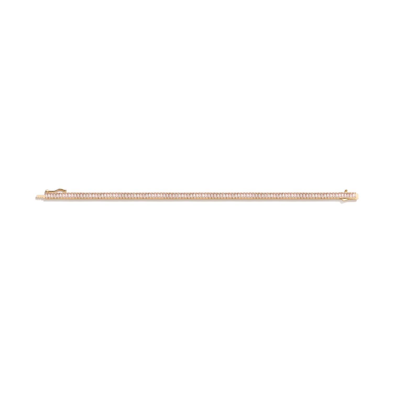 Crafted in gold vermeil. 6tcw of 3x1.5mm (0.10ct) AAA lab-grown morganite. Length: 6.5' or 7'. Width: 3.5mm. Thickness: 2.75mm. Weight: 10g. Box clasp with safety hook.
