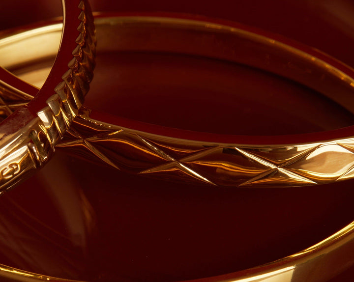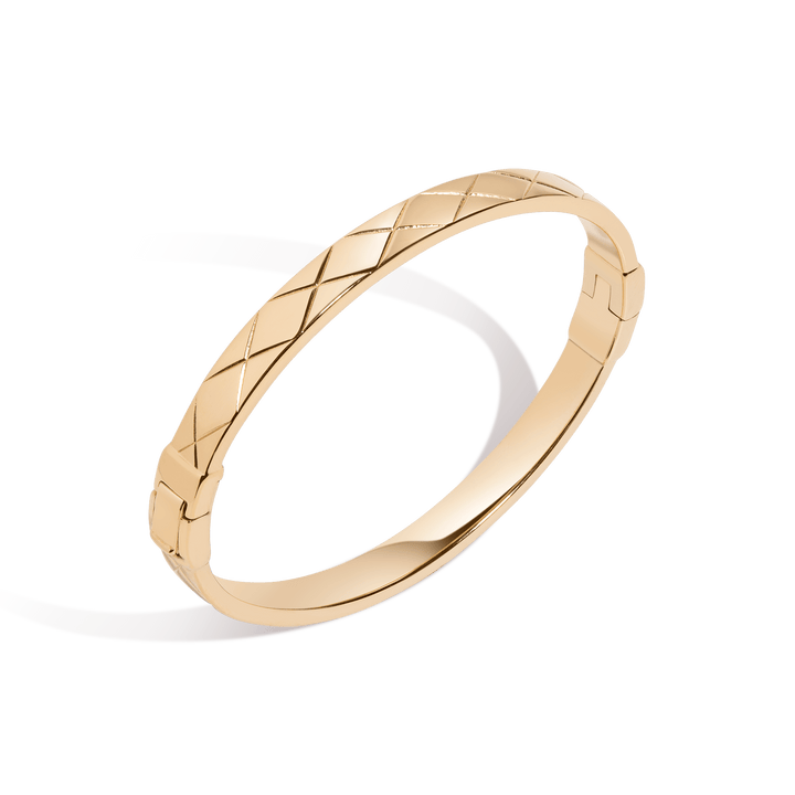 Crafted in gold vermeil with a flat X quilted pattern. Width: 6mm. Thickness: 3mm. Length: S/M (51×65mm, 18.3 cm), M/L (55×68mm, 19.4 cm). Weight: 32g. Box clasp closure.