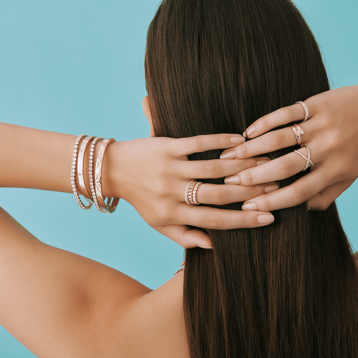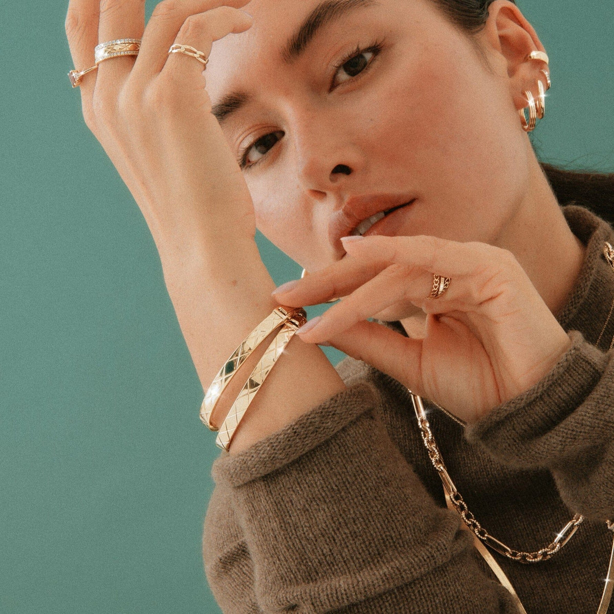 This Quilted Gold Hinged Bracelet by Aurate in vermeil delivers bold texture and golden glow with a more approachable edge. Its signature cross-hatch surface adds modern elegance to any wrist stack.