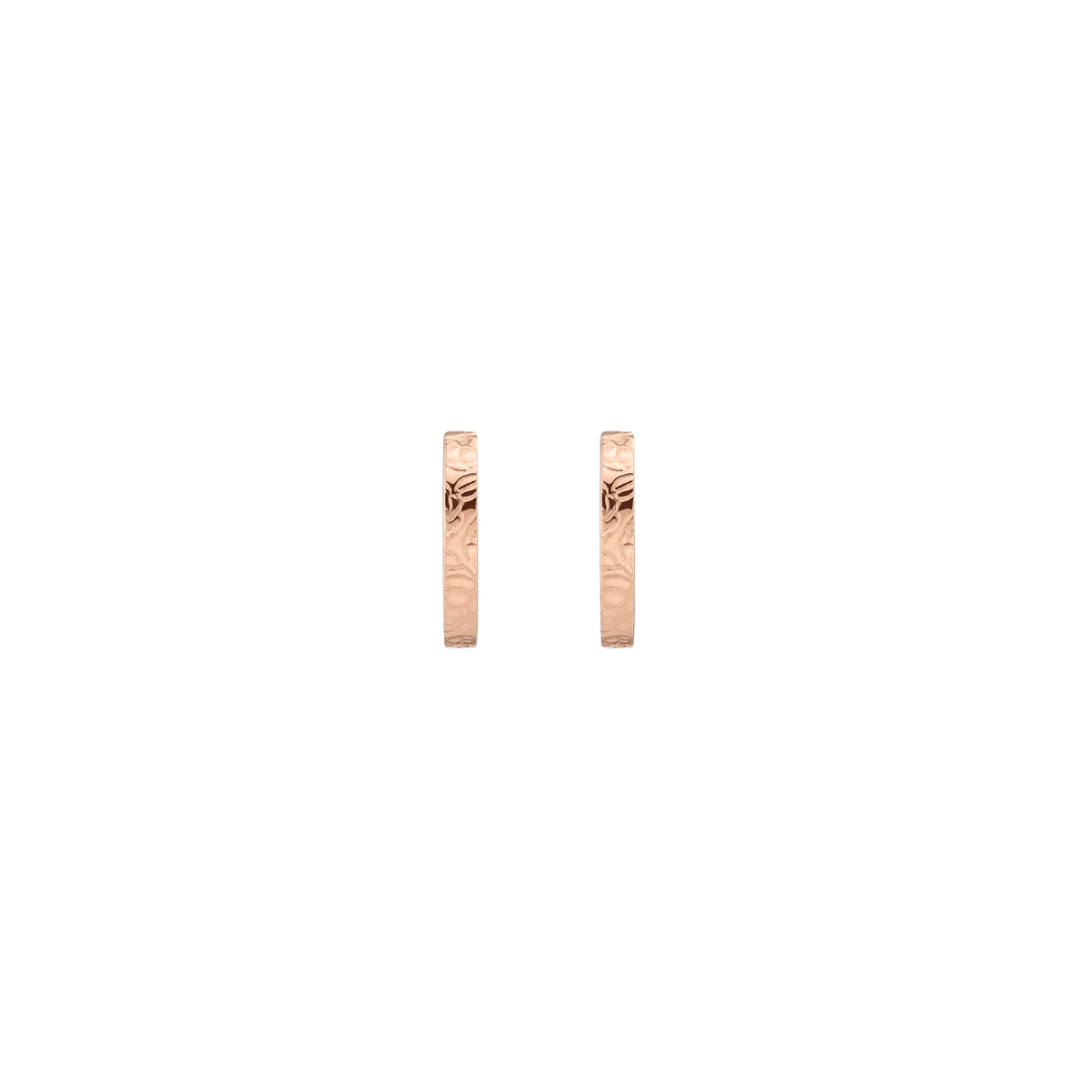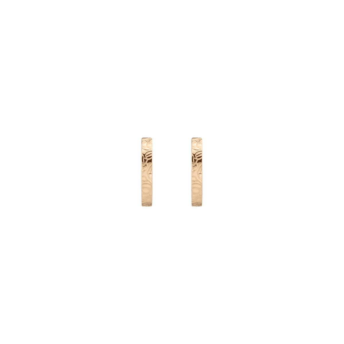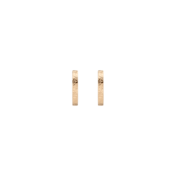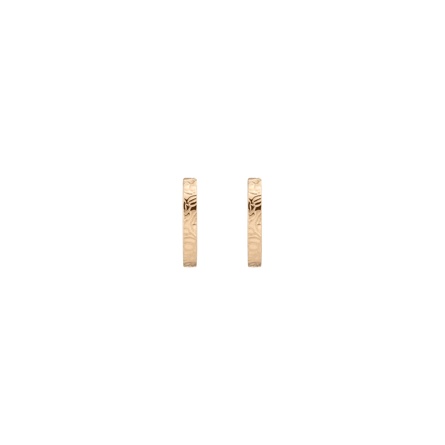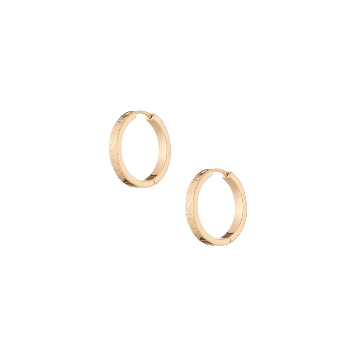 Crafted in gold vermeil. Debossed floral design on 3mm wide hoops. Interior diameter: 18mm. Thickness: 2mm. Weight: 7g per pair. Hinged closure.