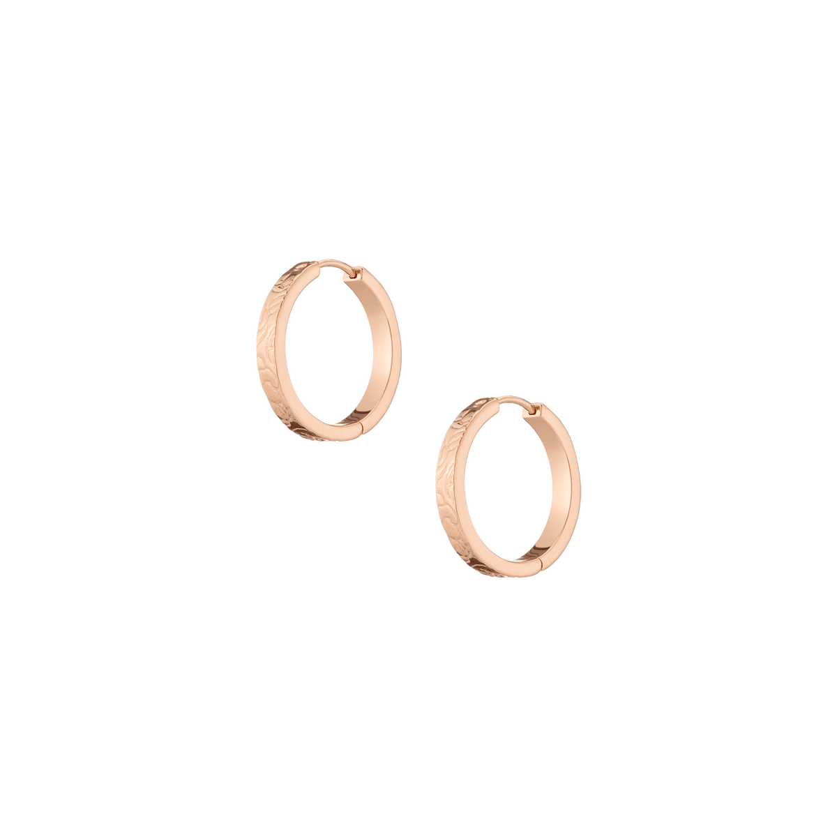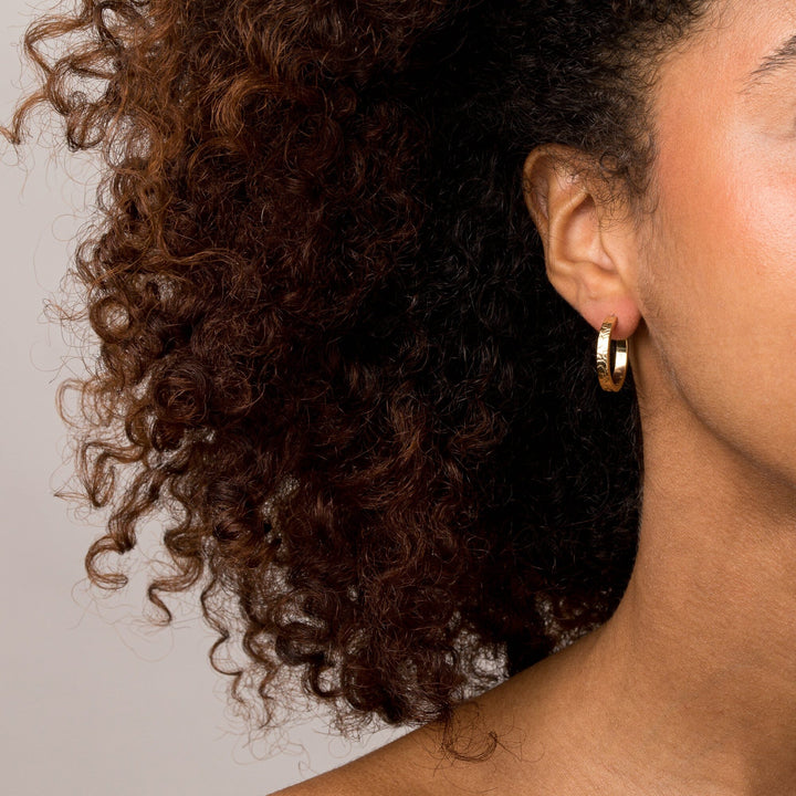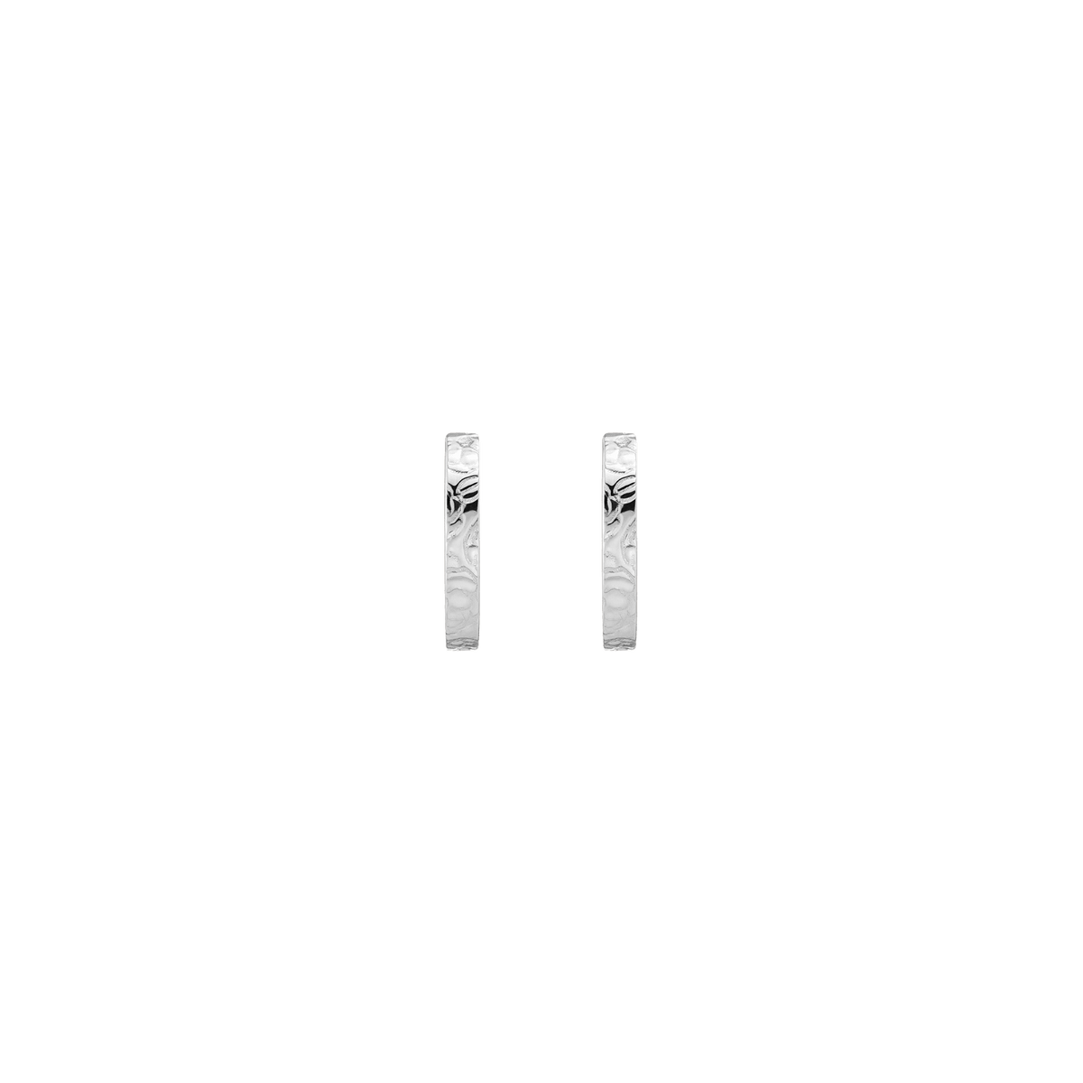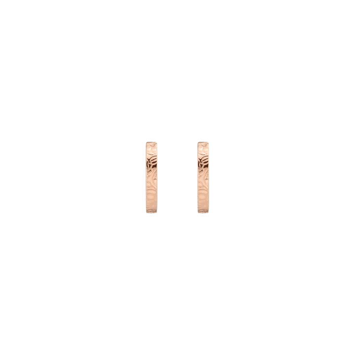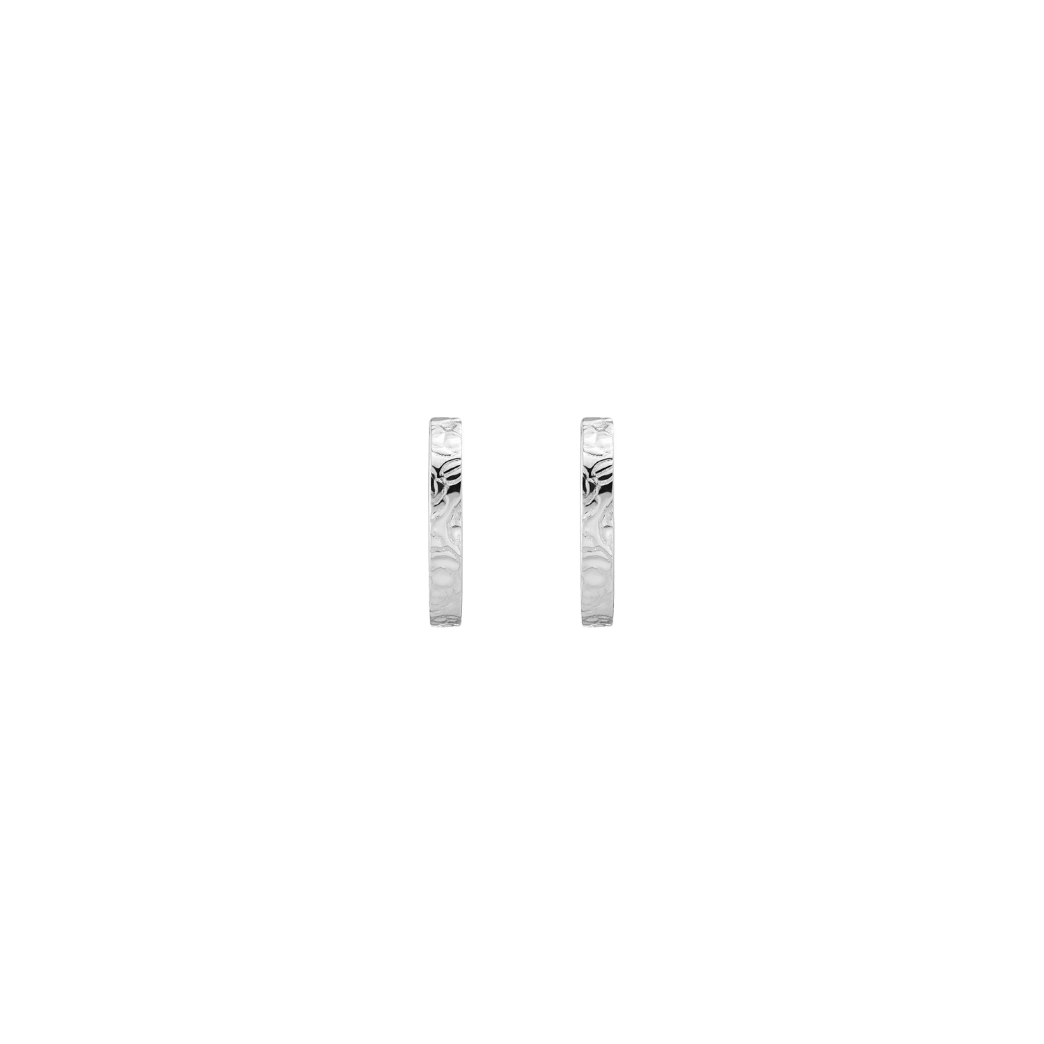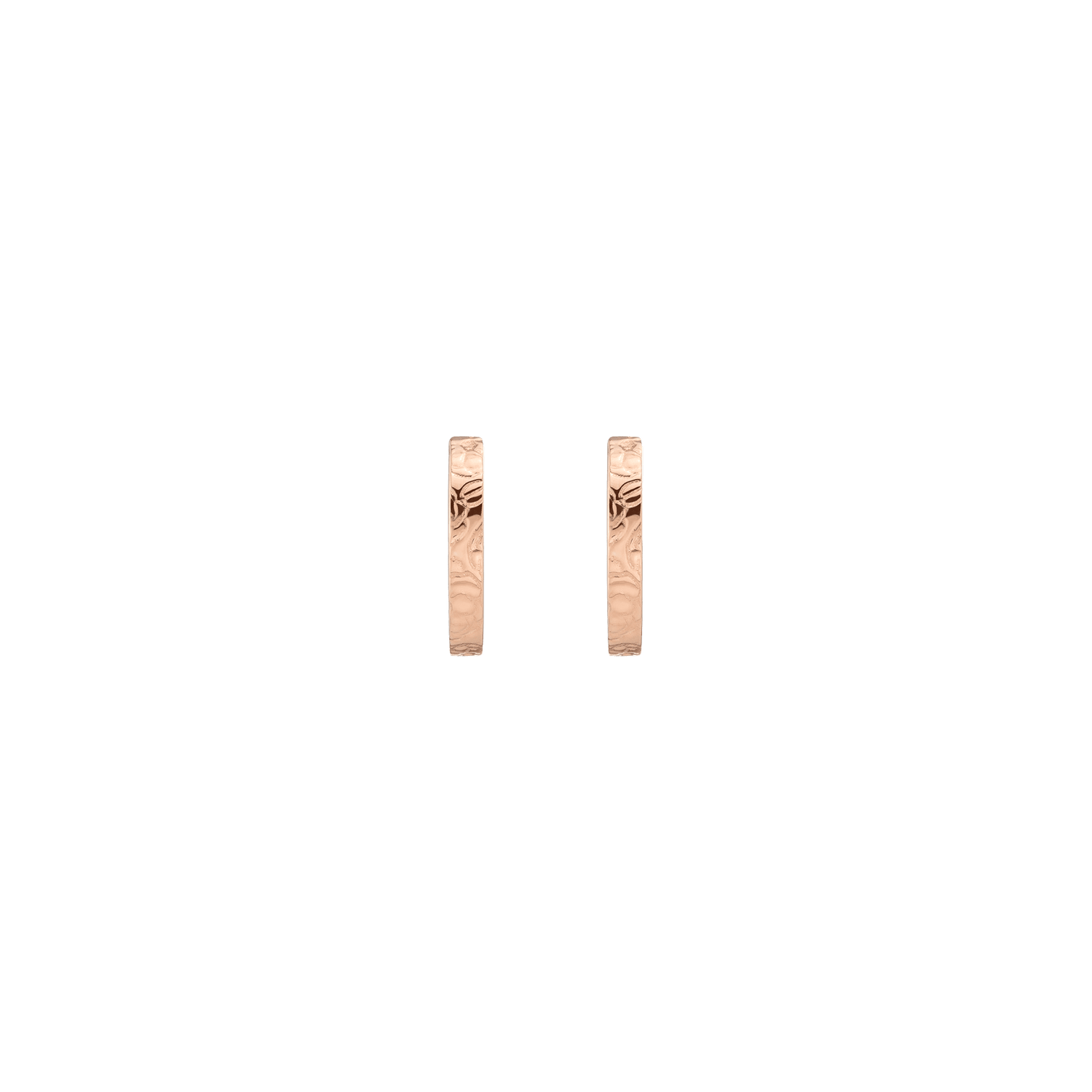 Crafted in gold vermeil. Debossed floral design on 3mm wide hoops. Interior diameter: 18mm. Thickness: 2mm. Weight: 7g per pair. Hinged closure.