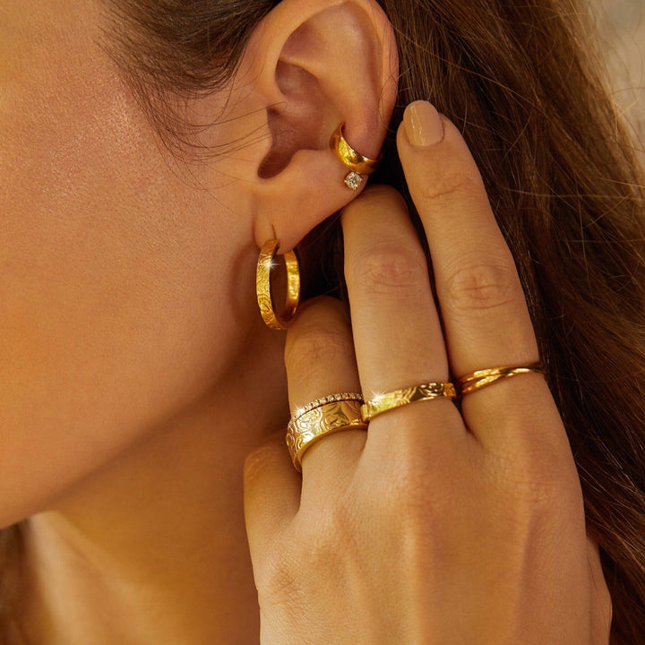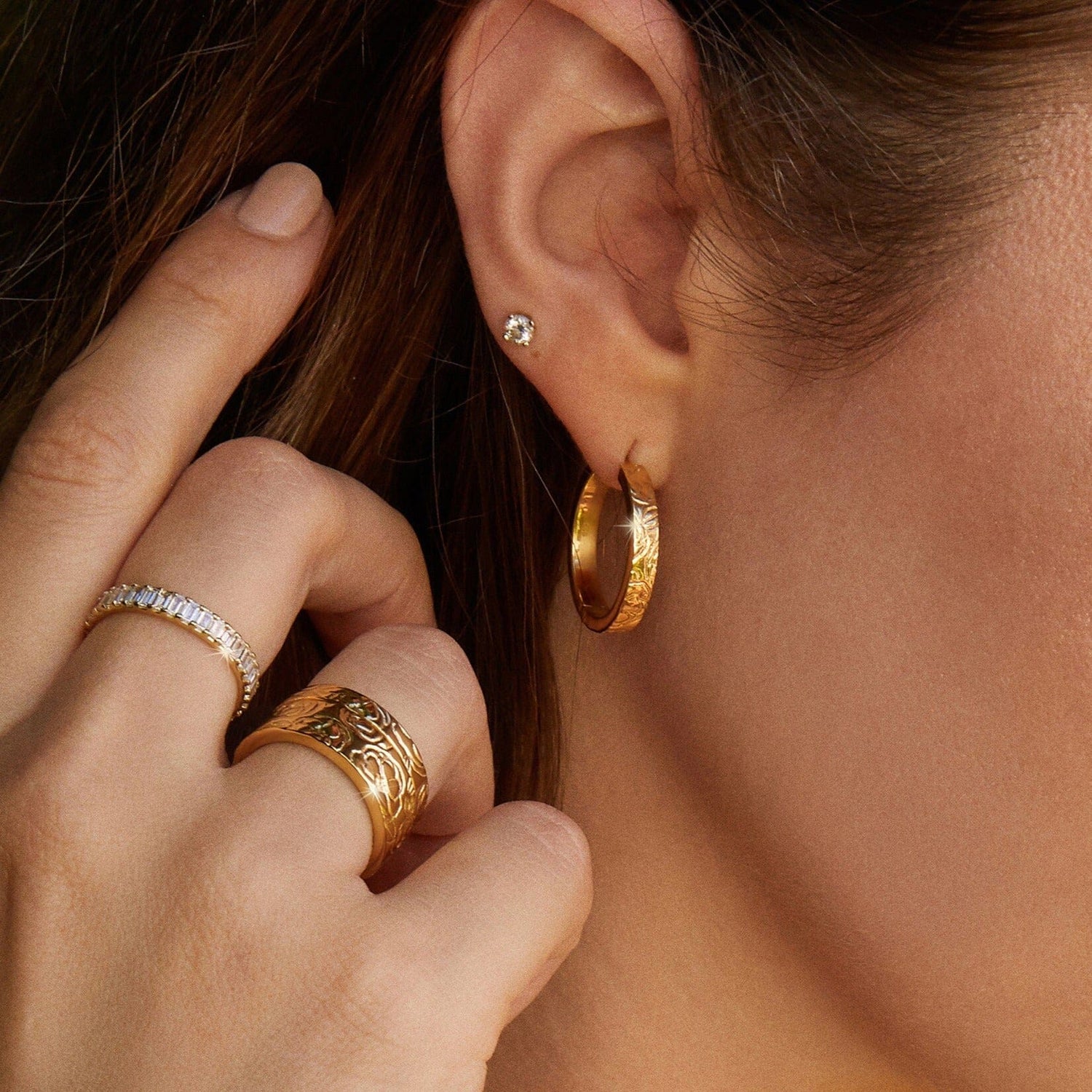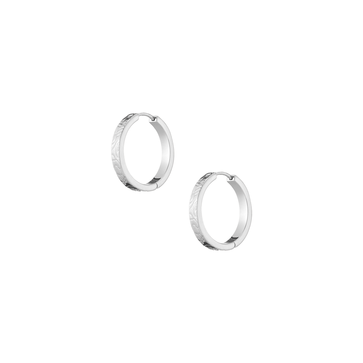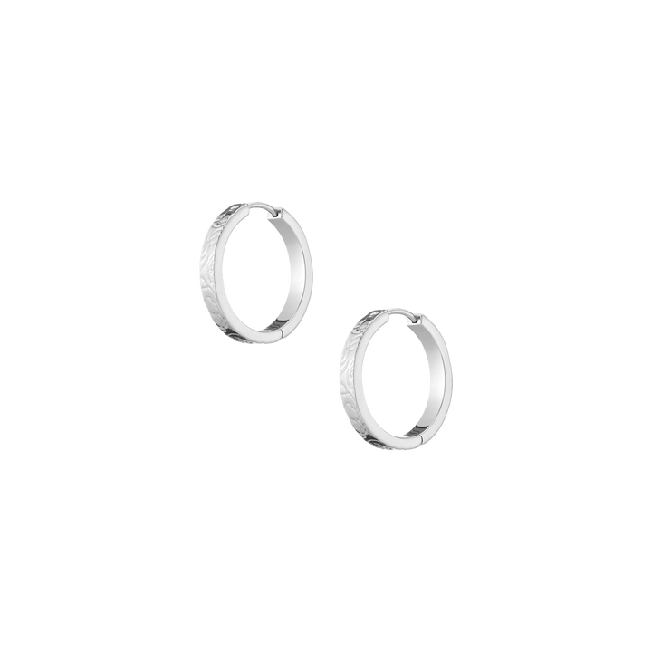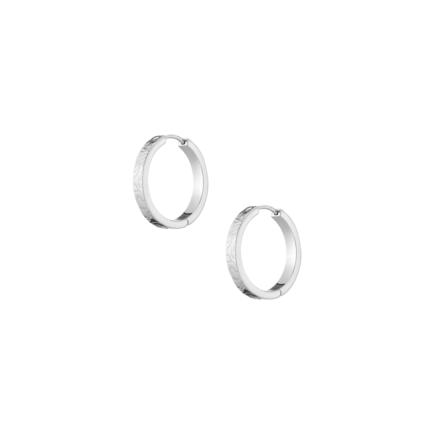 Crafted in gold vermeil. Debossed floral design on 3mm wide hoops. Interior diameter: 18mm. Thickness: 2mm. Weight: 7g per pair. Hinged closure.