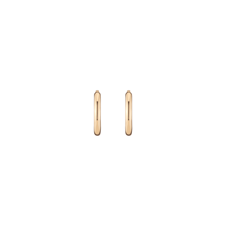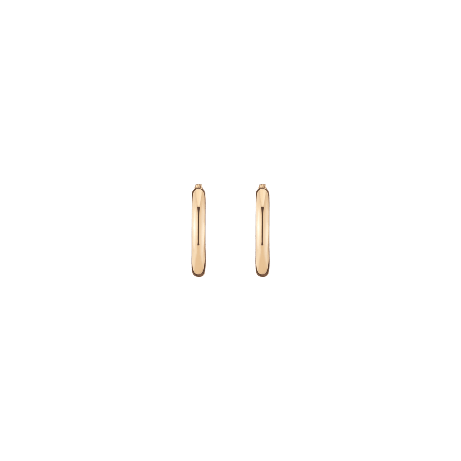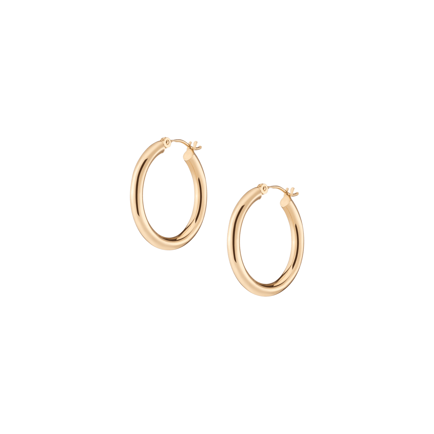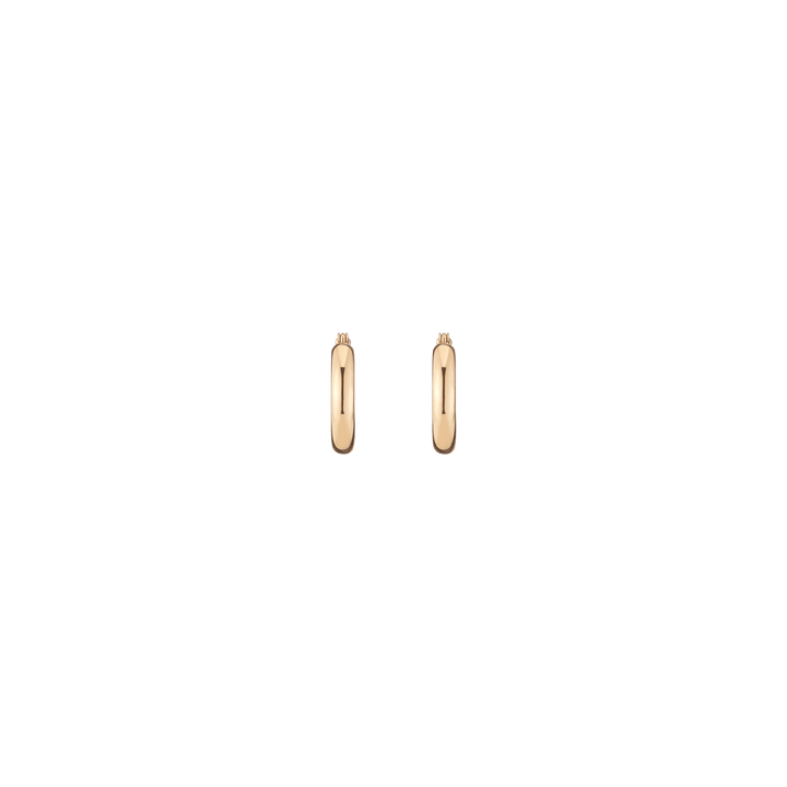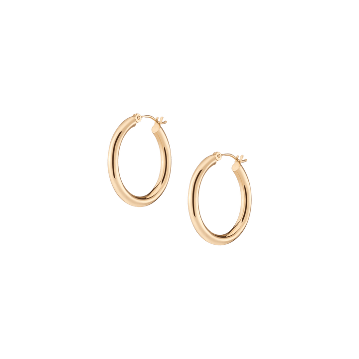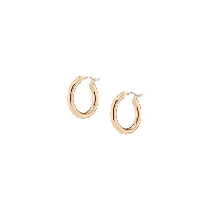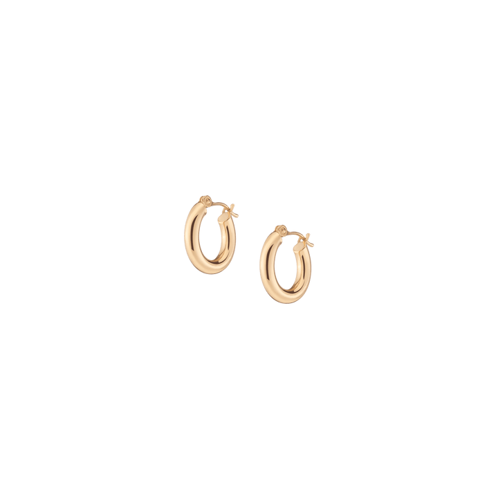 Handcrafted in 14k gold, hollow design. Available diameters: 15mm (1g), 20mm (1.2g), 25mm (1.5g). Width and thickness: 3mm. Hinged post with secure click latch.