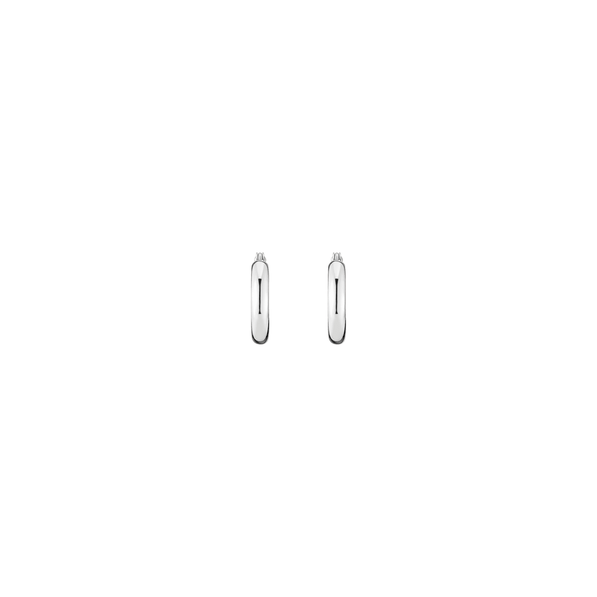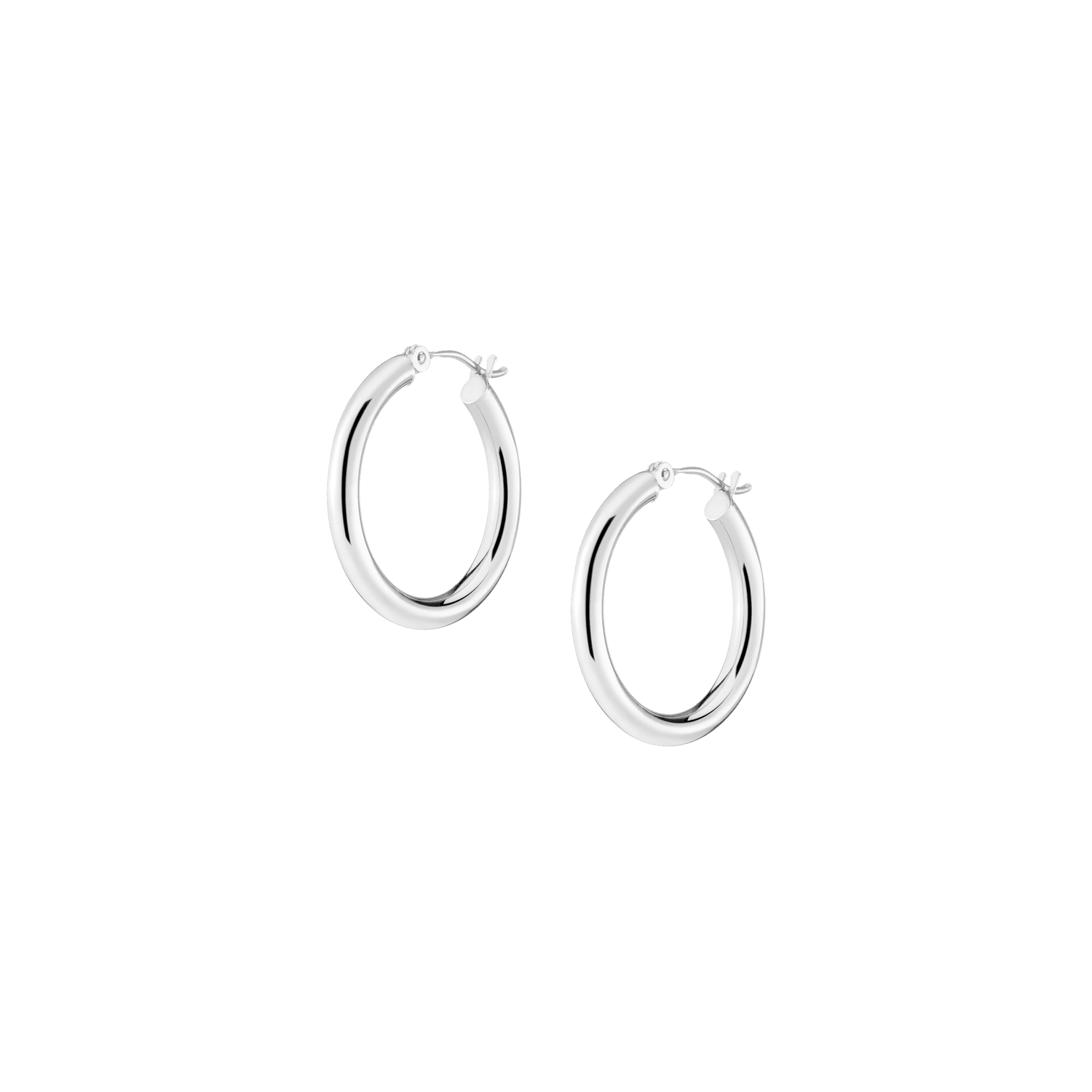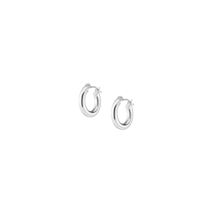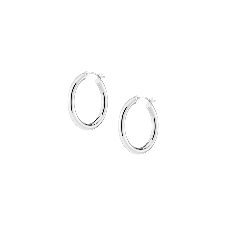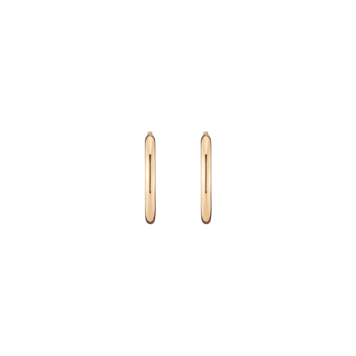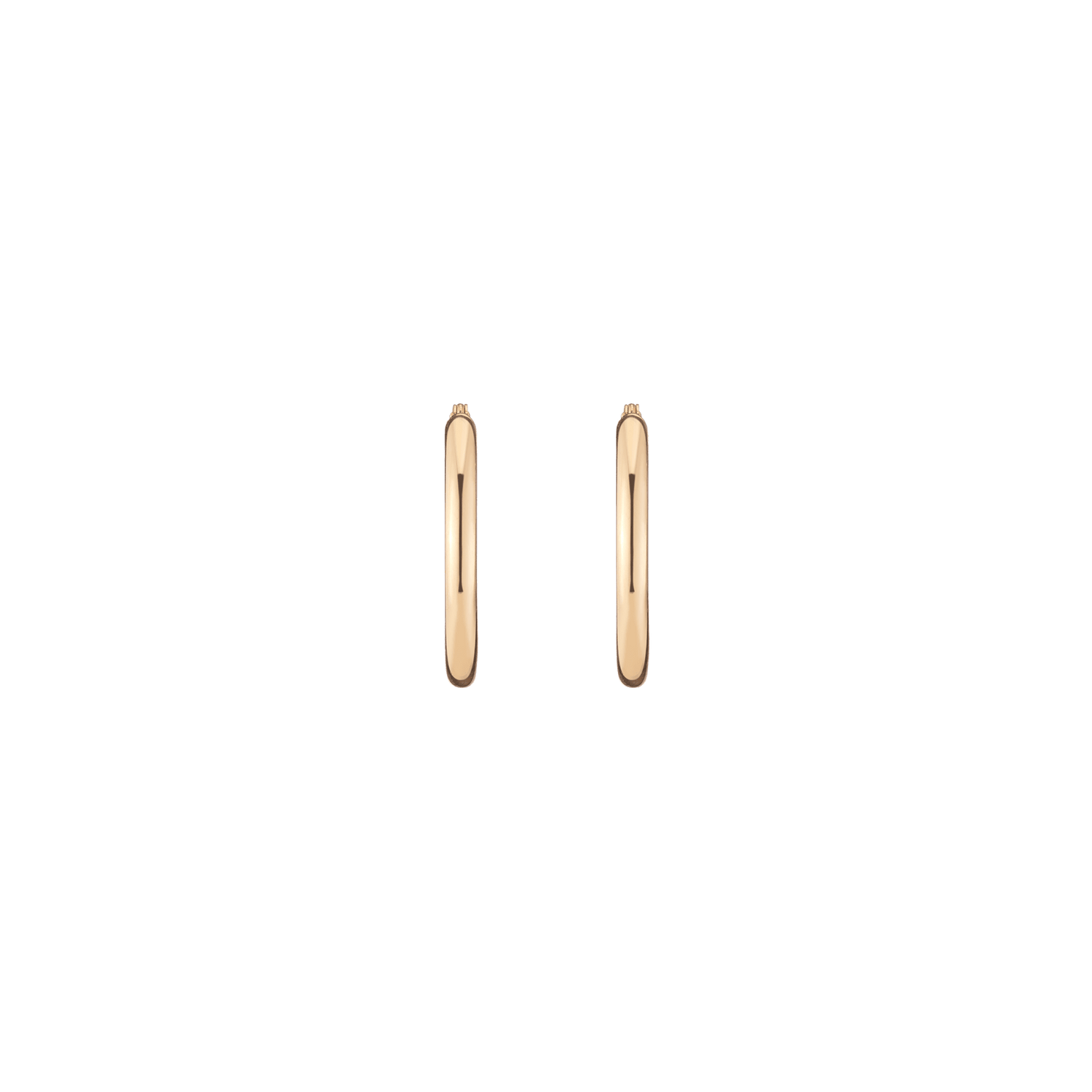 Handcrafted in 14k gold, hollow design. Available diameters: 15mm (1g), 20mm (1.2g), 25mm (1.5g). Width and thickness: 3mm. Hinged post with secure click latch.