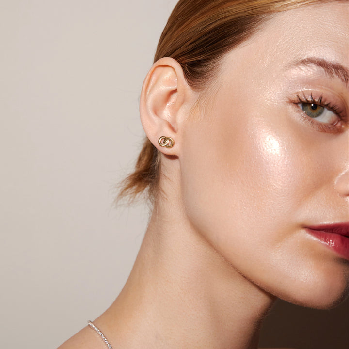 These Connection Stud Earrings by Aurate in 18k gold embody sleek minimalism. With their fluid, interlocking form and polished finish, they make a refined statement alone or styled with coordinating pieces. Secured with a classic post and wingnut back.