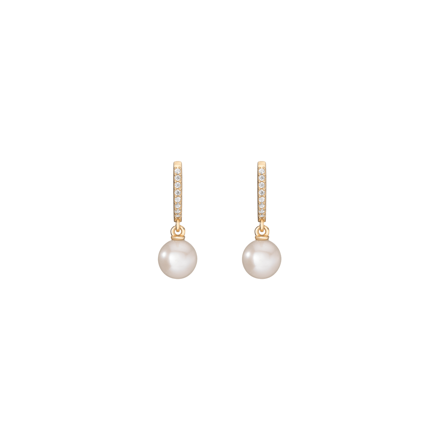 Crafted in 14k gold with 6mm AAA-grade freshwater cultured pearls. 16 GH/SI clarity diamonds (1mm each, total 0.08tcw). Width: 10mm, Thickness: 1.75mm, Weight: 4g. Hinging closure.