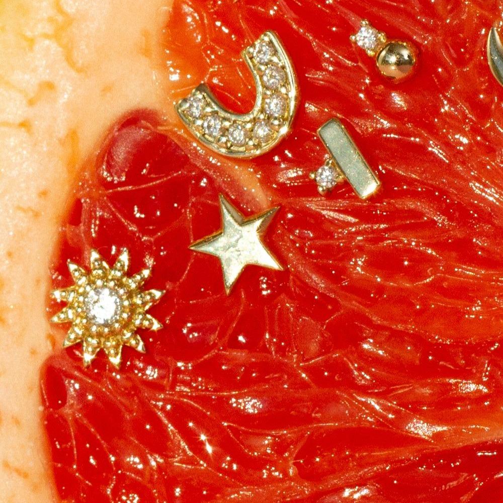 Handcrafted in 18k gold with a 2.4mm natural diamond. Measures 7.6mm x 7.6mm with a thickness of 2mm; total weight 0.5g.